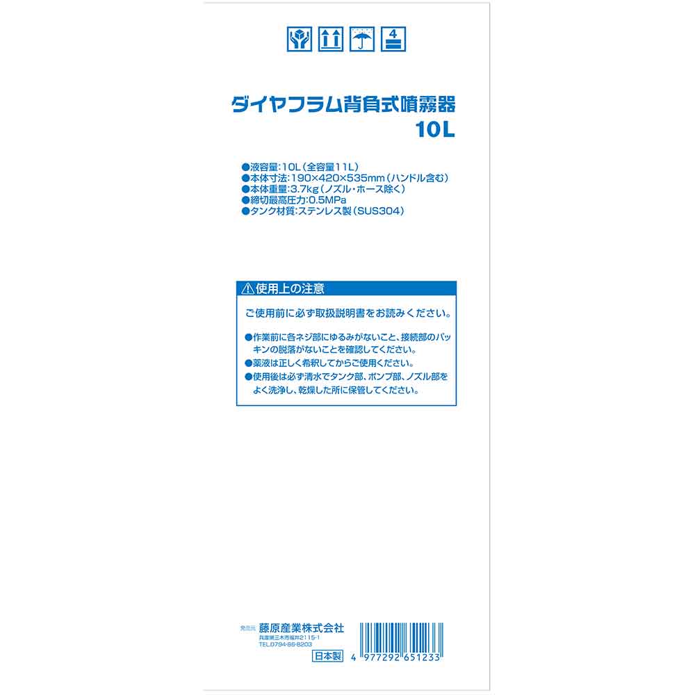 大容量、広い面積や長時間使用が可能な背負式噴霧器です。 噴霧作業。 庭木の殺虫・消毒に最適です。 丈夫なステンレスタンクです。 圧縮ハンドルが手元についているため、ビニルハウス内・温室・果樹等の散布に最適です。 防除用2頭口ノズル付です。 ●容量:液容量10L、全容量11L。 ●ノズル長さ:49cm。 ●ネジ規格:ISOネジ(PF1/4)。 ●常用最高圧力:0.5MPa。 ●本体重量:3.7kg(ホース、ノズル除く)。 ●耐圧力:0.7MPa。 ●付属品:ノズル2頭口・ノズルパイプ・ボールコック・ホース・計量カップ。