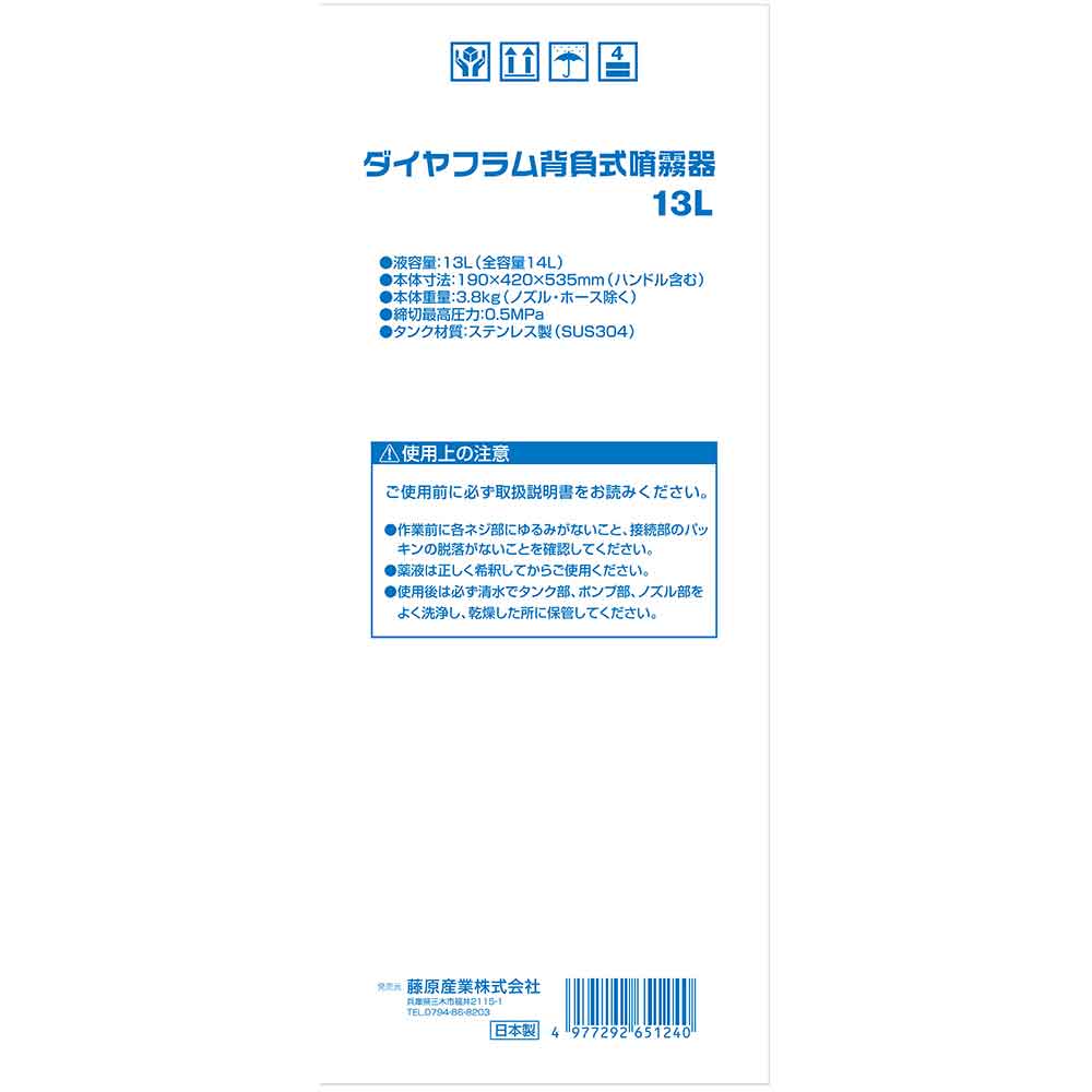大容量、広い面積や長時間使用が可能な背負式噴霧器です。 噴霧作業。 庭木の殺虫・消毒に最適です。 丈夫なステンレスタンクです。 圧縮ハンドルが手元についているため、ビニルハウス内・温室・果樹等の散布に最適です。 防除用2頭口ノズル付です。 ●容量:液容量13L、全容量14L。 ●ノズル長さ:49cm。 ●ネジ規格:ISOネジ(PF1/4)。 ●常用最高圧力:0.5MPa。 ●本体重量:3.8kg(ホース、ノズル除く)。 ●耐圧力:0.7MPa。 ●付属品:ノズル2頭口・ノズルパイプ・ボールコック・ホース・計量カップ。
