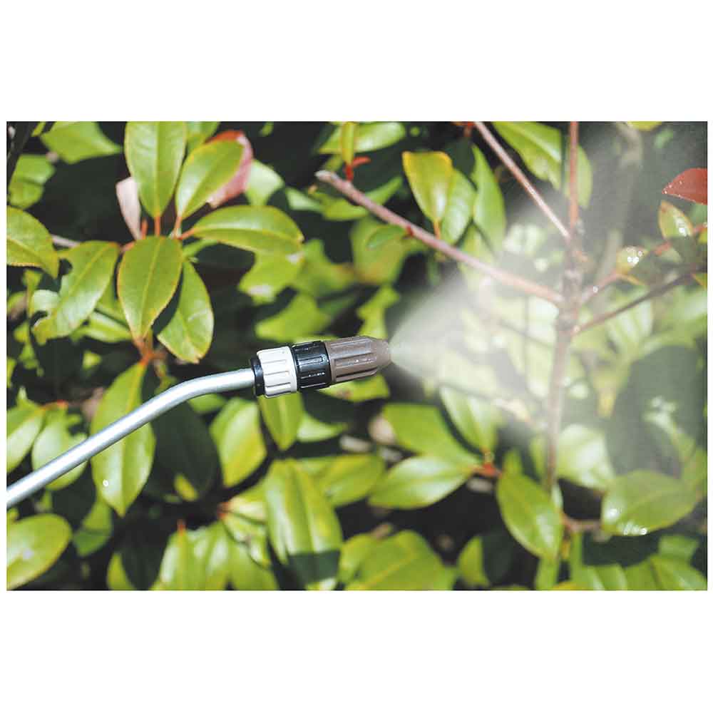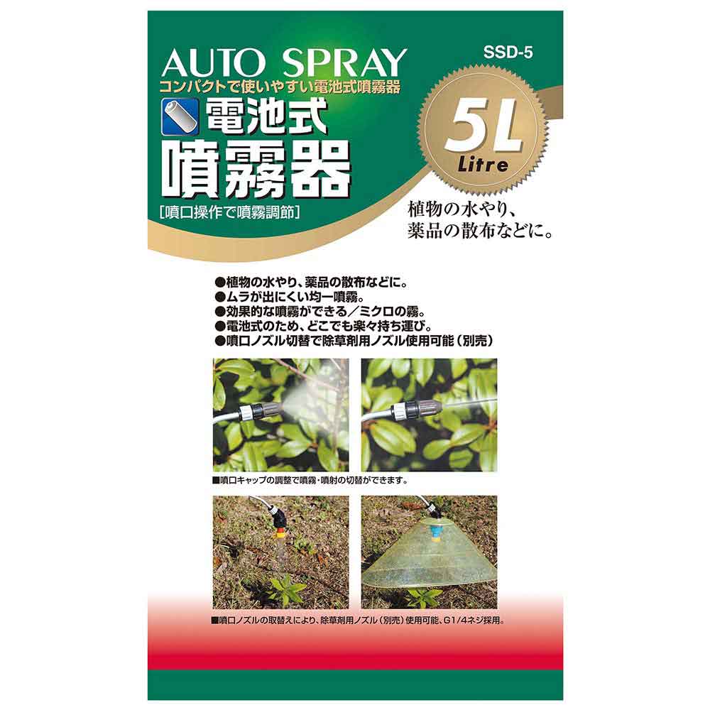 ミクロの噴霧粒子で、葉のすみずみまで効率よく散布します。 庭木の噴霧・除草剤の噴霧に最適な噴霧器。 噴霧圧が高い為、ミクロの霧で隅々まで効率よく噴霧作業ができます。 ノズル部を付け替えれば除草用噴口(別売)が取付可能です。 噴口キャップ調整で直射・噴霧が簡単に切り替えるとこができます。 コンパクトになる伸縮ノズル、目詰まり防止フィルター、肩掛けベルトが付いています。 ●タンク容量:5L。 ●電源:単1形乾電池4個。 ●ノズル長さ:約40~90cm。 ●重量(電池含む):約1.9kg。 ●電池寿命(総噴霧量):約120L。 ●噴霧量:約300ml/分。 ●噴射量:約440ml/分。 ●ホース長さ:約1.7m。