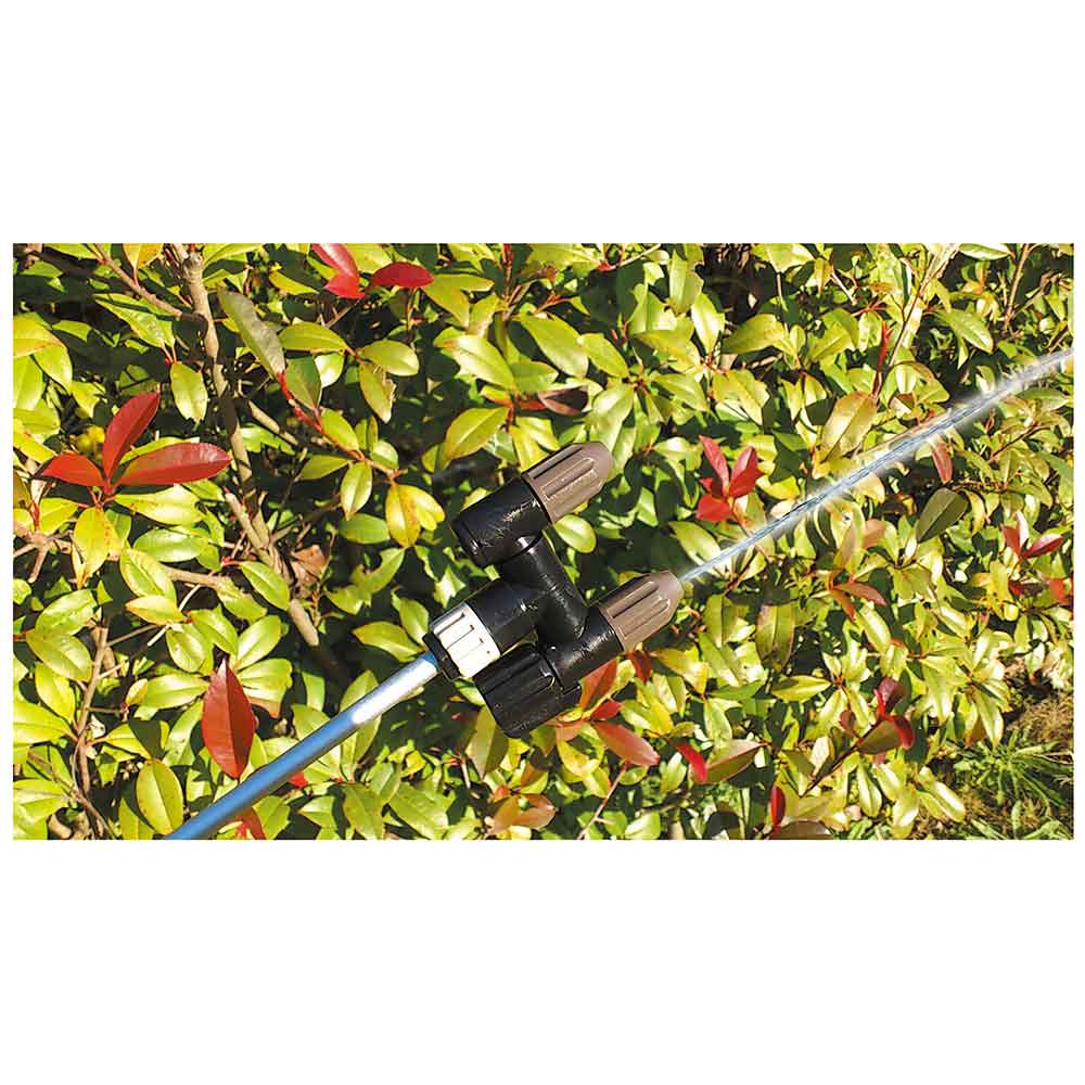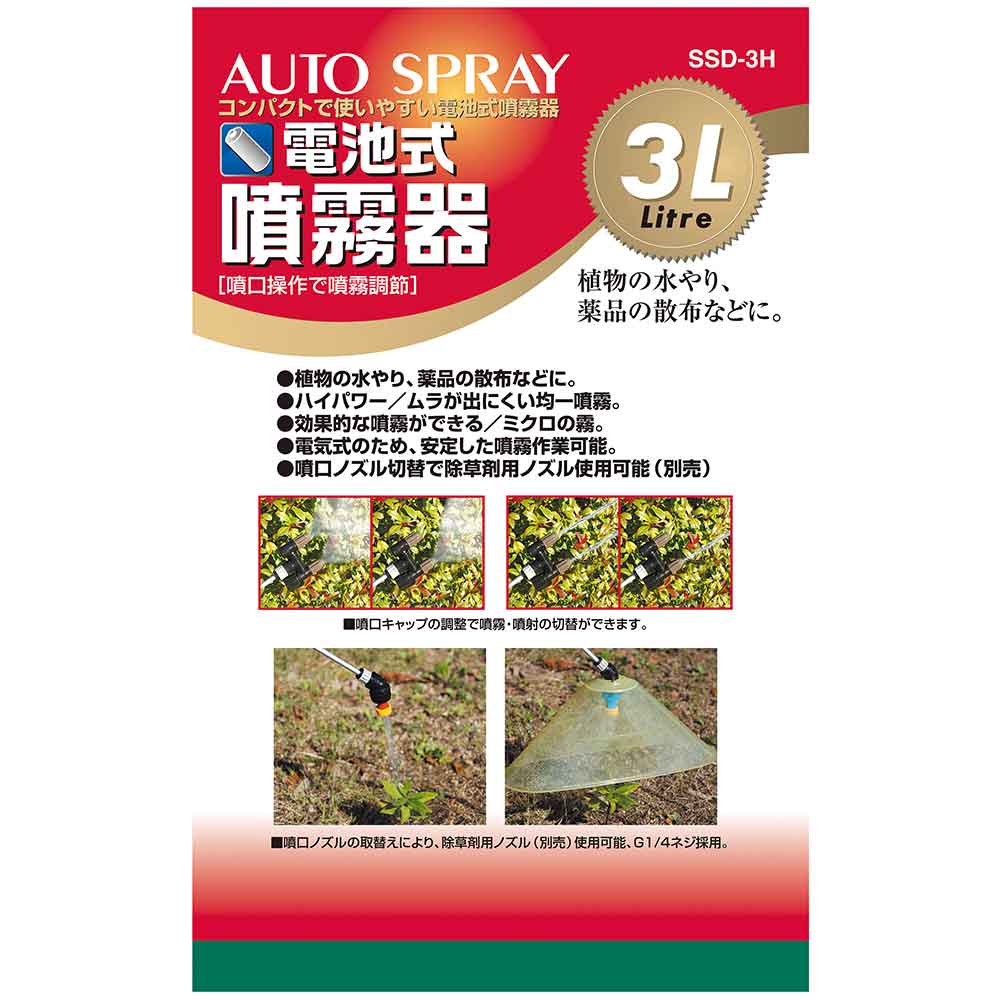 ミクロの噴霧粒子で、葉のすみずみまで効率よく散布します。 庭木の噴霧・除草剤の噴霧に最適な噴霧器。 噴霧圧が高い為、ミクロの霧で隅々まで効率よく噴霧作業ができます。 ノズル部を付け替えれば除草用噴口(別売)が取付可能です。 ハイパワータイプの為、噴霧量約2倍(当社比)です。 1頭・2頭の切替可能な為、用途に合わせた最適な噴霧ができます。 噴口キャップ調整で直射・噴霧が簡単に切り替えるとこができます。 ●タンク容量:3L。 ●電源:単1形乾電池6個。 ●ノズル長さ:約40~90cm。 ●重量(電池含む):約2.1kg。 ●電池寿命(総噴霧量):(1頭口)約80L・(2頭口)約190L。 ●噴霧量:1頭口約400ml・2頭口約660ml/分。 ●噴射量:1頭口約640ml・2頭口約830ml/分。 ●ホース長さ:約1.7m。