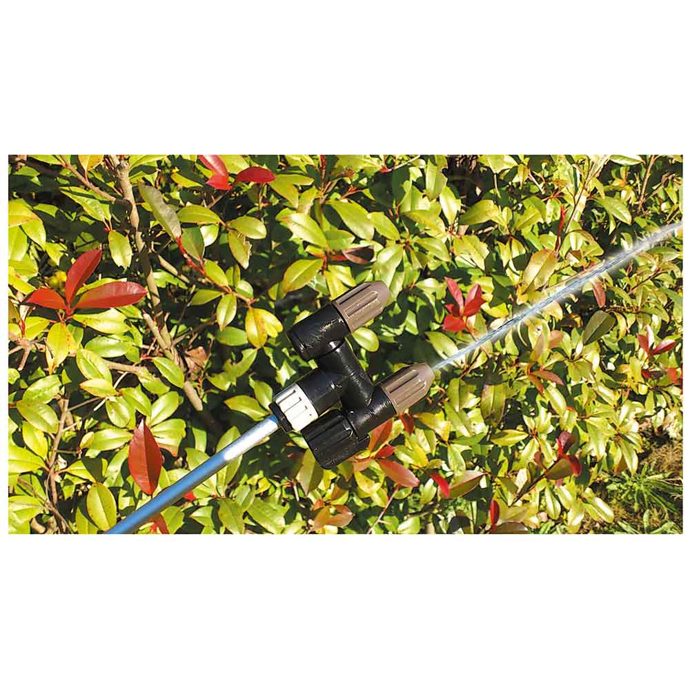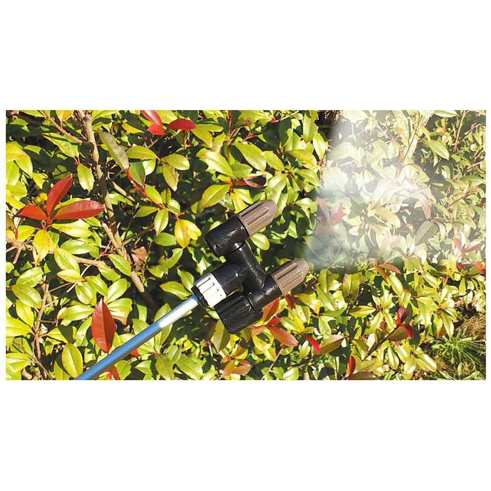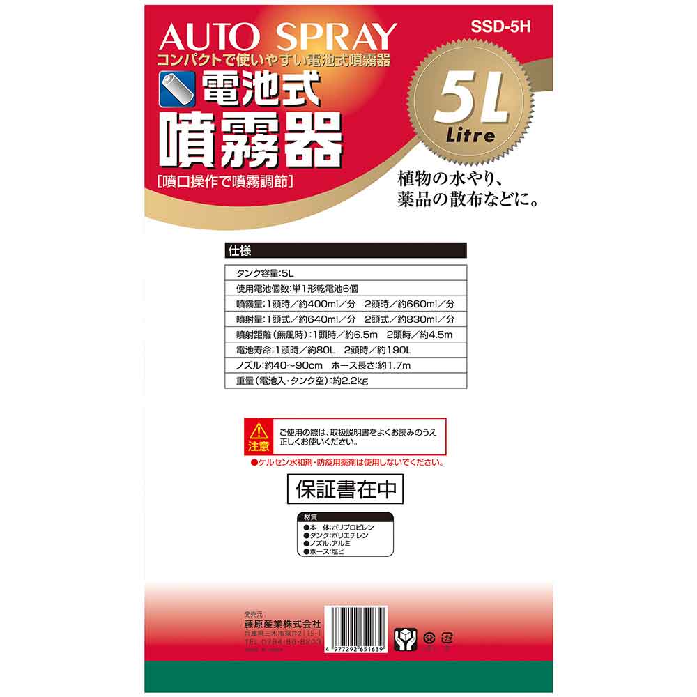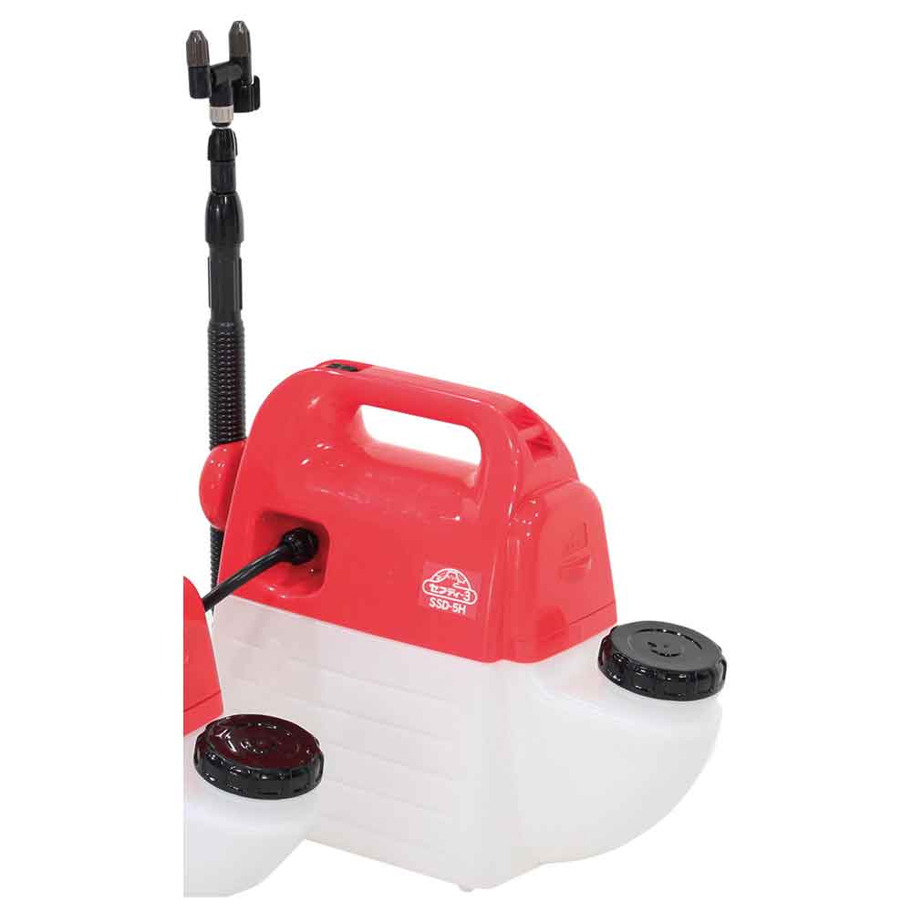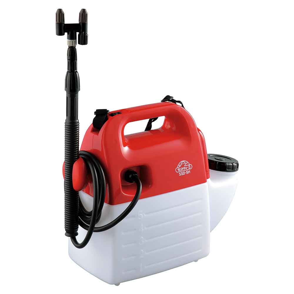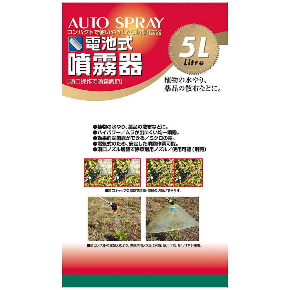 ミクロの噴霧粒子で、葉のすみずみまで効率よく散布します。 庭木の噴霧・除草剤の噴霧に最適な噴霧器。 噴霧圧が高い為、ミクロの霧で隅々まで効率よく噴霧作業ができます。 ノズル部を付け替えれば除草用噴口(別売)が取付可能です。 ハイパワータイプの為、噴霧量約2倍(当社比)です。 1頭・2頭の切替可能な為、用途に合わせた最適な噴霧ができます。 噴口キャップ調整で直射・噴霧が簡単に切り替えるとこができます。 ●タンク容量:5L。 ●電源:単1形乾電池6個。 ●ノズル長さ:約40~90cm。 ●重量(電池含む):約2.2kg。 ●電池寿命(総噴霧量):(1頭口)約80L・(2頭口)約190L。 ●噴霧量:1頭口約400ml・2頭口約660ml/分。 ●噴射量:1頭口約640ml・2頭口約830ml/分。 ●ホース長さ:約1.7m。