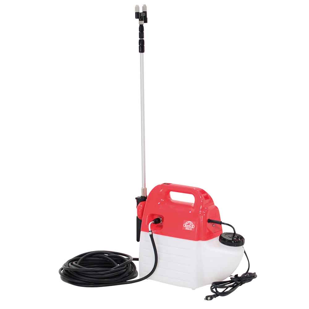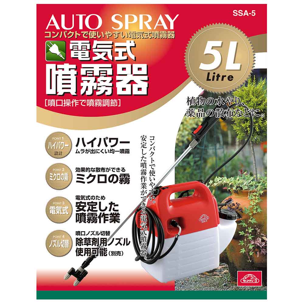 ミクロの噴霧粒子で、葉のすみずみまで効率よく散布します。 庭木の噴霧・除草剤の噴霧に最適な噴霧器。 噴霧圧が高い為、ミクロの霧で隅々まで効率よく噴霧作業ができます。 ノズル部を付け替えれば除草用噴口(別売)が取付可能です。 1頭・2頭の切替可能な為、用途にあわせた最適な噴霧ができます。 噴口キャップ調整で直射・噴霧が簡単に切り替えるとこができます。 噴霧・噴射のスタート、ストップが手元でできる手元バルブ、目詰まり防止フィルターが付いています。 ●タンク容量:5L。 ●電源:AC100V。 ●ノズル長さ:約70~160cm。 ●重量:約2.4kg。 ●コード長さ:約2.5m。 ●噴霧量:1頭口約300ml・2頭口約600ml/分。 ●噴射量:1頭口約380ml・2頭口約700ml/分。 ●ホース長さ:約10m。