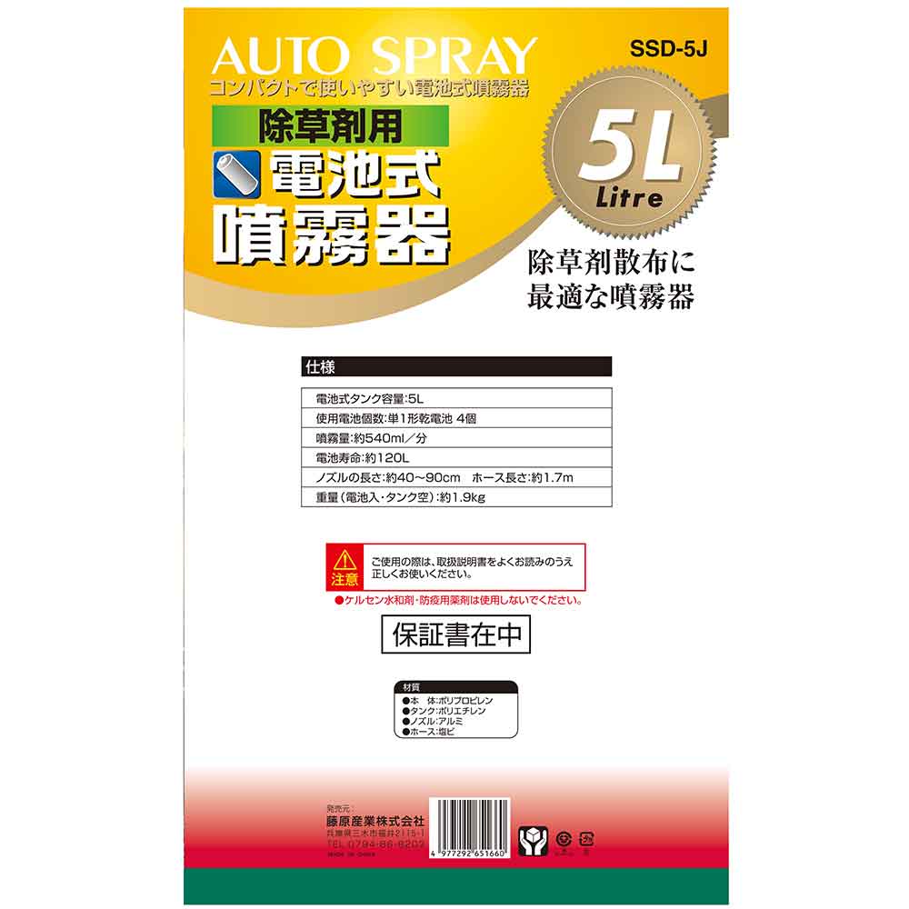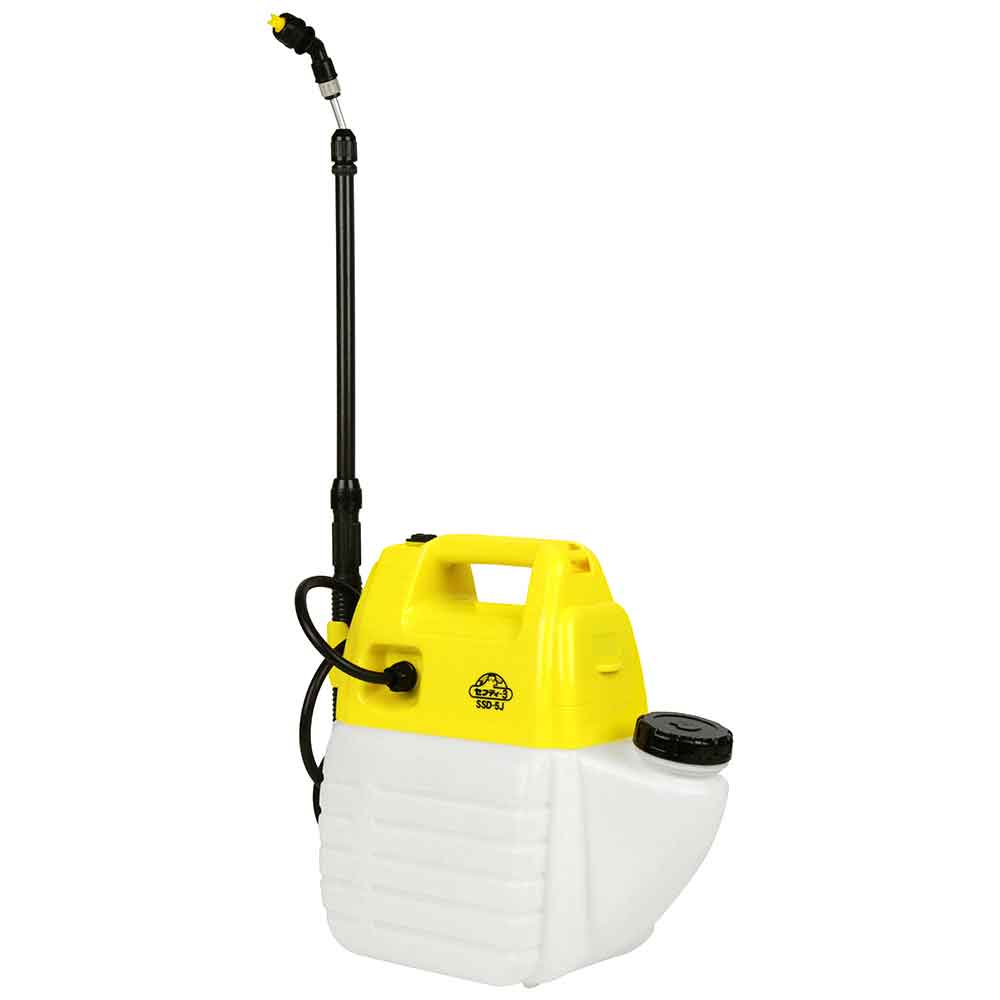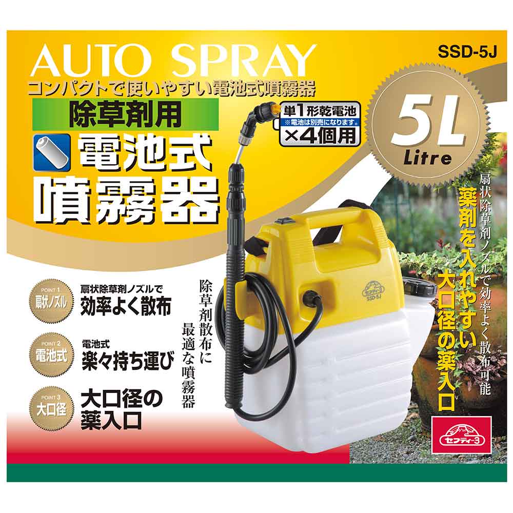コンパクトで使いやすい電池式噴霧器、除草剤用です。 除草剤の散布が可能な電池式噴霧器。 扇状除草剤ノズルで効率よく散布出来ます。 薬剤が入れやすい大口径の薬入口です。 電池式で持ち運びが楽に行えます。 ●タンク容量:5L。 ●サイズ:幅310×高さ360×奥行175mm。 ●重量:1800g(電池含・タンク空)。 ●使用電池:単1形乾電池4個。 ●噴霧量:約540ml/分。 ●電池寿命:約120L。 ●ノズル長さ:40~90cm・ホース長さ:約1.7m。