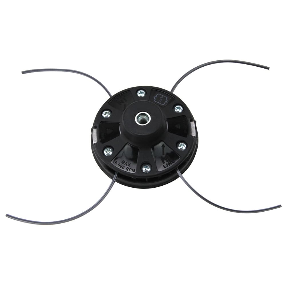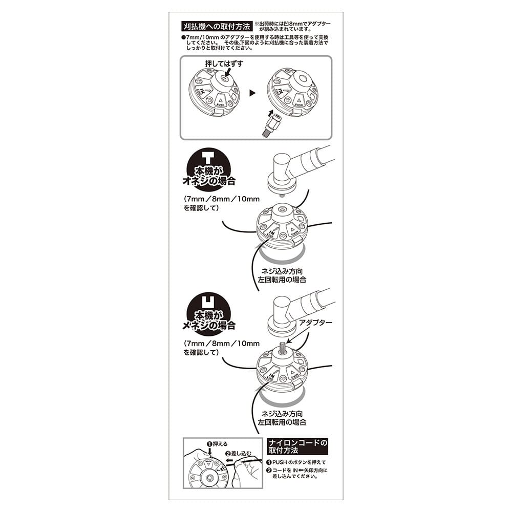 コードの交換が分かり易い挟み込み式です。 草刈作業用。 ナイロンコードの交換が押さえて差し込むクイックロック方式で、取り換えが簡単にできます。 多くのサイズ・形のコードに対応し、作業性抜群の4本出し設計です。 ソーブレードも使用できます。 20cc以上の刈払機でご使用下さい。 ギアケース7mm・8mm・10mm対応しています。 ●適応ナイロンコード:○2.0~2.4mm・□2.2~3.0mm・ねじり2.2~2.4mm・ギザ刃3.0mm。 ●付属アダプター:7・8・10mm凹凸。 ●チタニウムナイロンコード四角型直径2.2mm×長さ30cm・4本付。 ●重量:約200g(コード・アダプター除く)。 ●出荷時凹8mmアダプター取付。