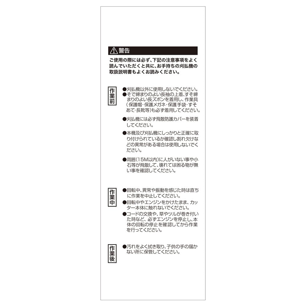 ご使用の際には必ず、台紙の注意事項をよく読んでいただくと共に、お手持ちの刈払機の取扱説明書もよくお読みください。 刈払機以外に使用しないでください。そで締まりのよい長袖の上着、すそ締まりのよい長ズボンを着用し、作業具(保護帽・保護メガネ・保護手袋・すそあて・長靴等)も必ず着用してください。 刈払機には必ず飛散防護カバーを装着してください。本機及び刈払機にしっかりと正確に取り付けられているか確認し、割れ欠けなどの異常がある場合は使用しないでください。