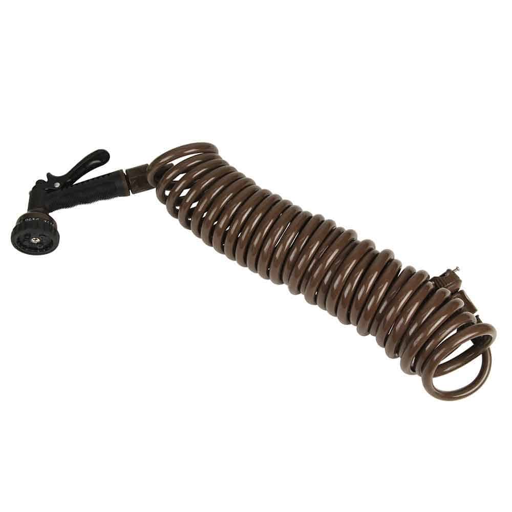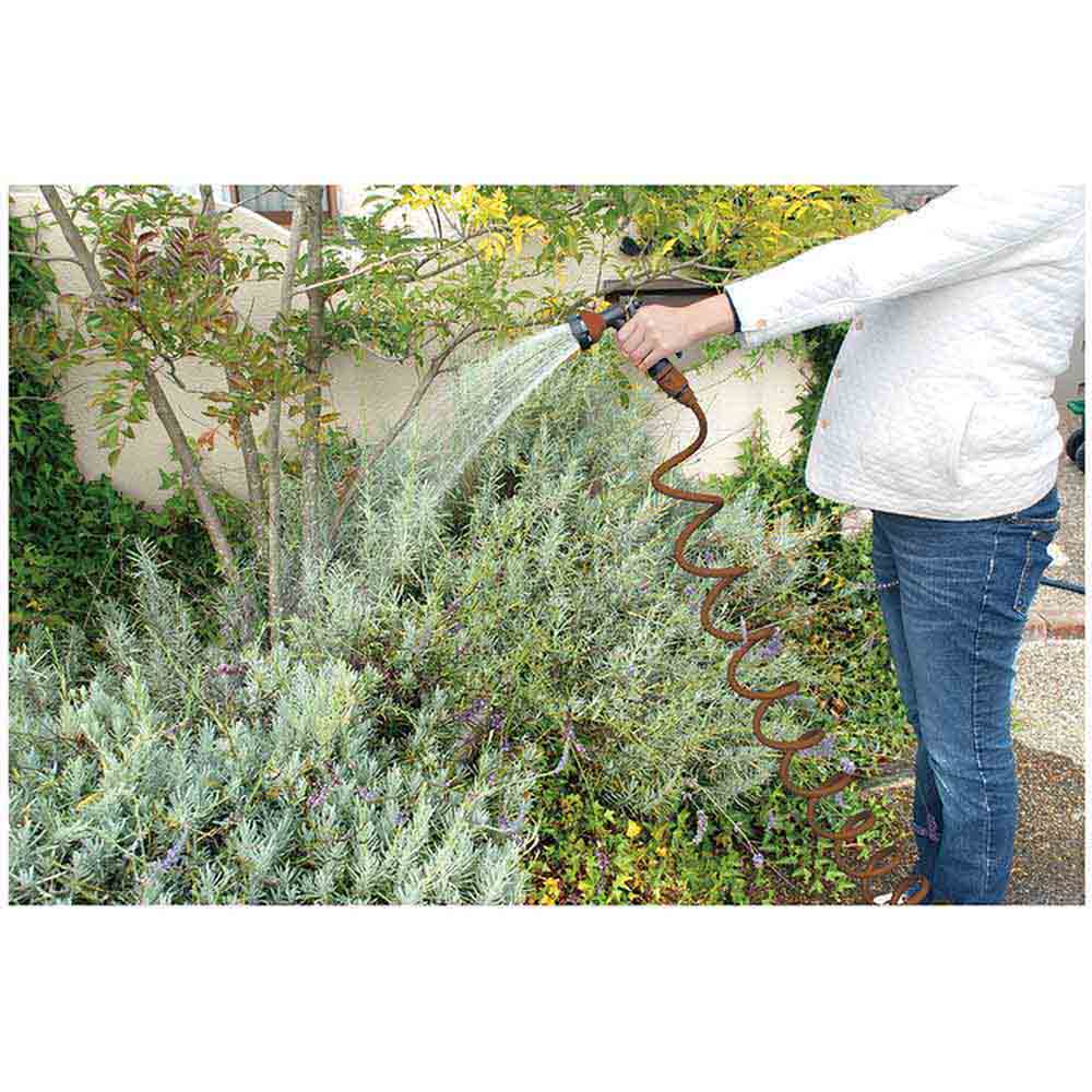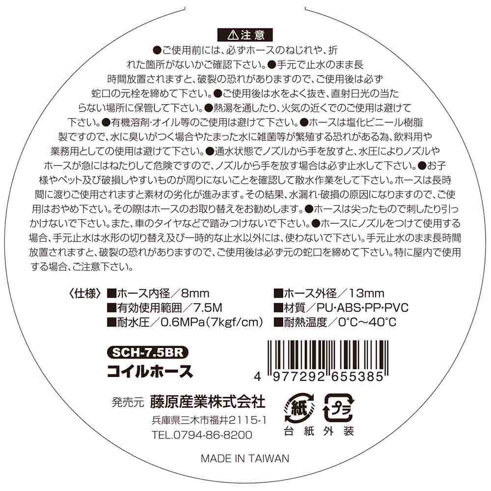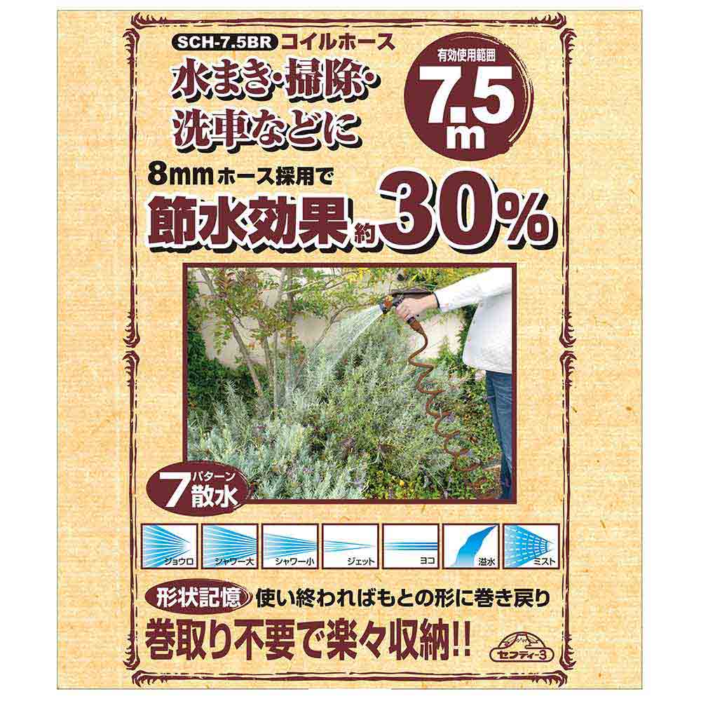 巻きとり不要なコイルタイプなので、楽に収納が出来ます。 水まき・掃除・洗車など多用途対応の散水コイルホース。 8mmホース採用で節水効果が約30%です(当社従来比)。 コイルタイプなので、使い終わればすぐ元に戻ります。 藻が発生しにくいホースを採用しています。 散水ノズルは7パターンです。 ●ホース有効使用範囲:7.5m。 ●ホース内径:8mm。 ●散水パターン:ジェット・シャワー(大・小)・ジョウロ・溢水・ストレート・霧。 ●散水ノズル:7パターン。 ●耐水圧:0.6MPa(7kgf/cm)。 ●耐熱温度:0~40度。 ●色:ブラウン。