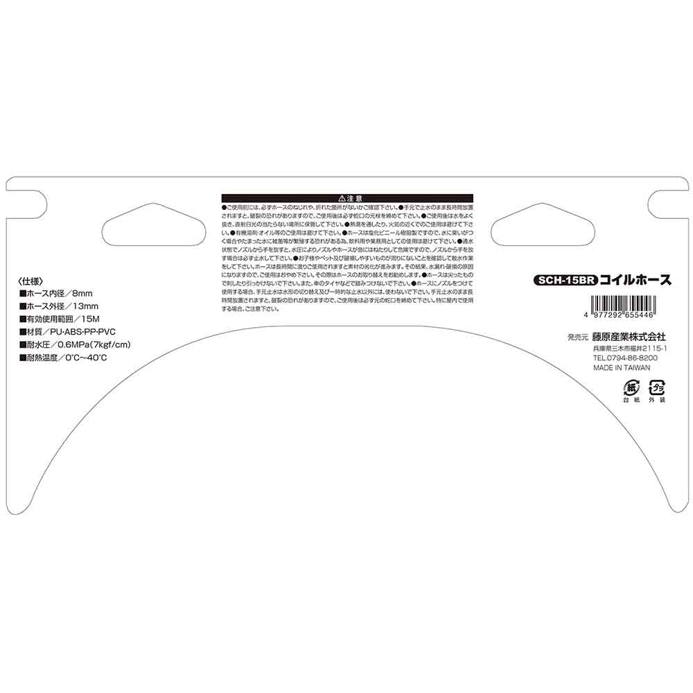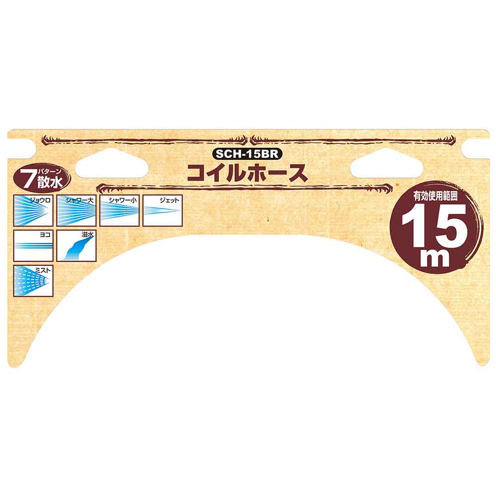 巻きとり不要なコイルタイプなので、楽に収納が出来ます。 水まき・掃除・洗車など多用途対応の散水コイルホース。 8mmホース採用で節水効果が約30%です(当社従来比)。 コイルタイプなので、使い終わればすぐ元に戻ります。 藻が発生しにくいホースを採用しています。 散水ノズルは7パターンです。 ●ホース有効使用範囲:15m。 ●ホース内径:8mm。 ●散水パターン:ジェット・シャワー(大・小)・ジョウロ・溢水・ストレート・霧。 ●散水ノズル:7パターン。 ●耐水圧:0.6MPa(7kgf/cm)。 ●耐熱温度:0~40度。 ●色:ブラウン。