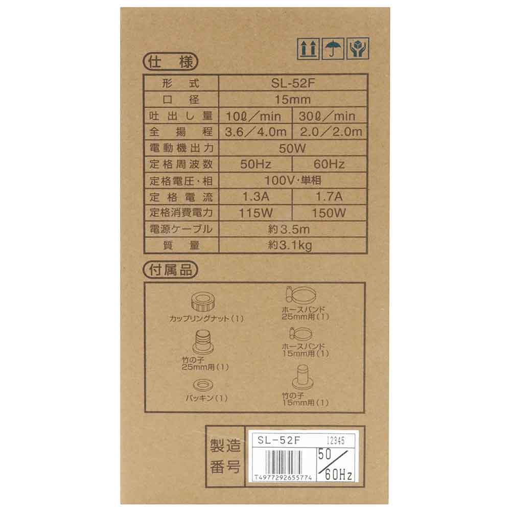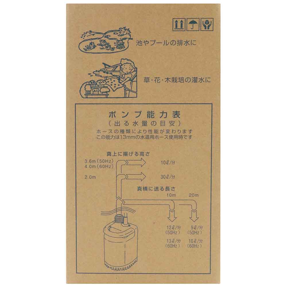 ご家庭での使用に最適な水中ポンプです。 池の循環・散水・排水用水中ポンプ。 小型・軽量です。 ストレーナーはワンタッチで取外しできます。 お風呂の残り湯を洗濯機に利用できます。 つまりが少ない、セミボルテックス機構を採用しています。 ●口径:15mm。 ●全揚程:2m。 ●吐出し量:30L/min。 ●電源:単相100V。 ●消費電力:130/160W(50/60Hz)。 ●ケーブル長:3.5m。 ●総重量:3500g。