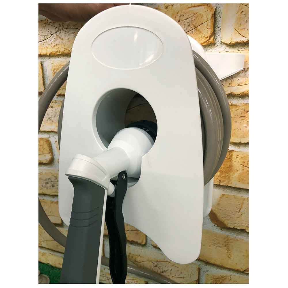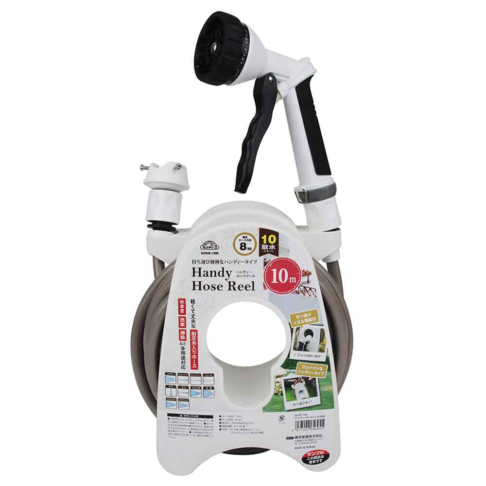 持ち運び便利なハンディータイプのホースリールです。 水まき・掃除・洗車など多用途対応の散水ホースリール。 水まき・掃除・洗車など多用途対応の散水ホースリールです。 収納に便利な引掛けノズル機能付です。 ノズルは10パターンでシャワー・ストレート大・ストレート小・タテ・ヨコ・ミスト・ジェット・5ポイント・4ポイント・拡散です。 軽くて丈夫な耐圧糸入りホースです。 ●ホース内径:8mm。 ●耐水圧:0.69Mpa(7kgf/cm)。 ●耐熱温度:0度~40度。 ●ホース長さ:10m。