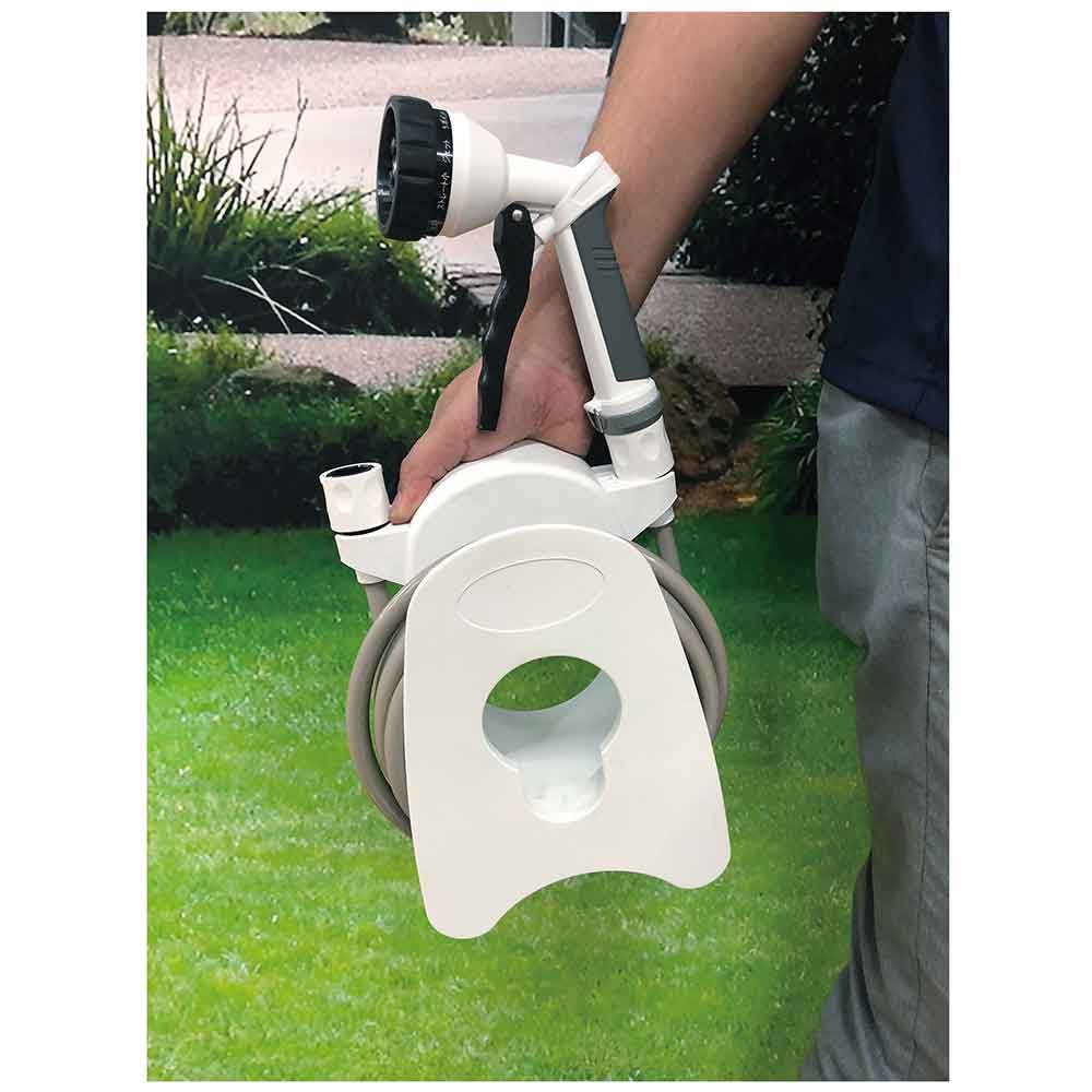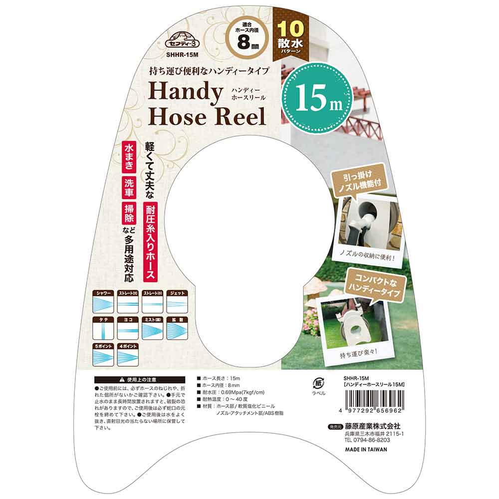 持ち運び便利なハンディータイプのホースリールです。 水まき・掃除・洗車など多用途対応の散水ホースリール。 水まき・掃除・洗車など多用途対応の散水ホースリールです。 収納に便利な引掛けノズル機能付です。 ノズルは10パターンでシャワー・ストレート大・ストレート小・タテ・ヨコ・ミスト・ジェット・5ポイント・4ポイント・拡散です。 軽くて丈夫な耐圧糸入りホースです。 ●ホース内径:8mm。 ●耐水圧:0.69Mpa(7kgf/cm)。 ●耐熱温度:0度~40度。 ●ホース長さ:15m。
