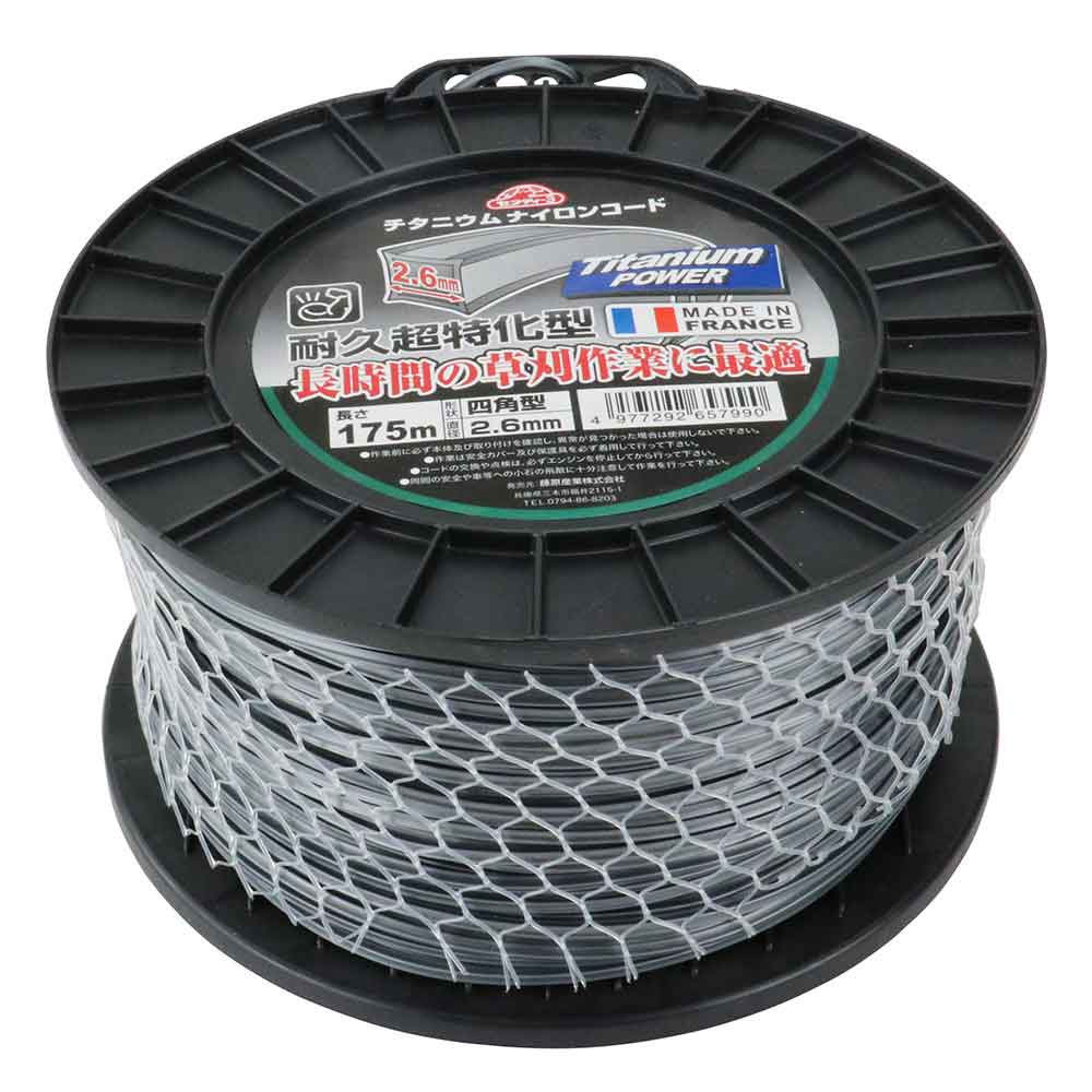 チタニウム含有で耐久性が約5倍(当社比)になりました。 刈払機用ナイロンコード。 小石の多いところ・フェンス、塀の際・雑草、植木の周囲での作業に最適です。 ●四角型。 ●直径:2.6mm。 ●長さ:175m。
