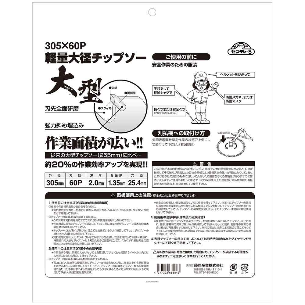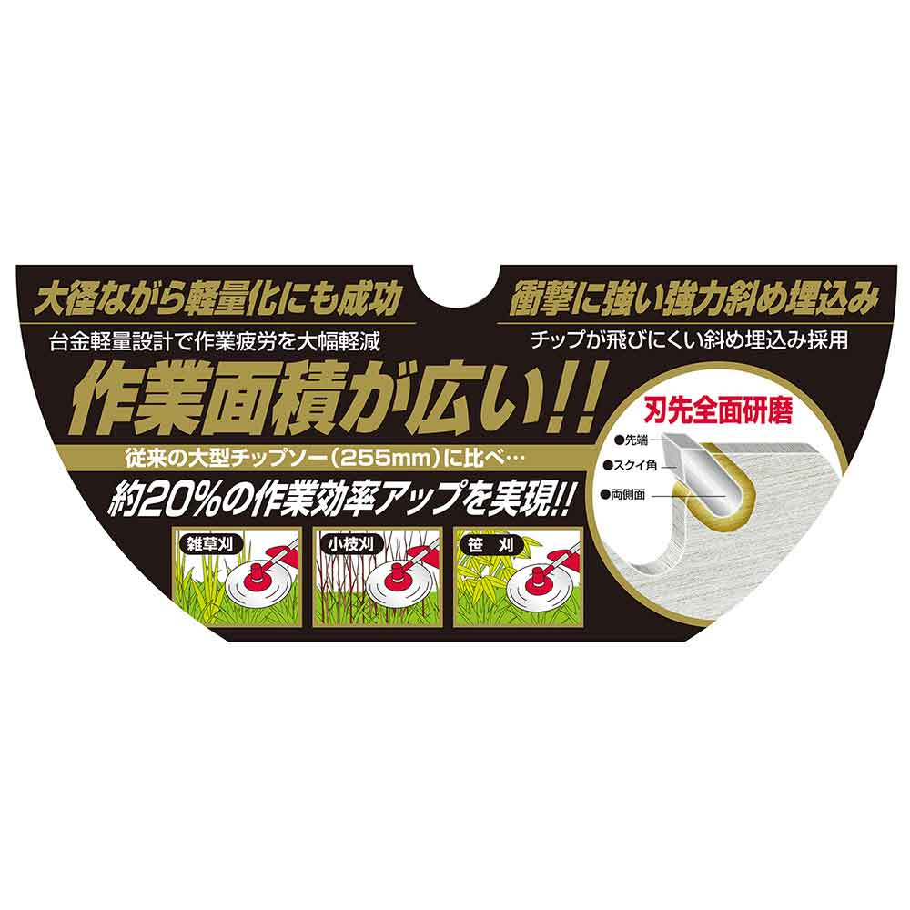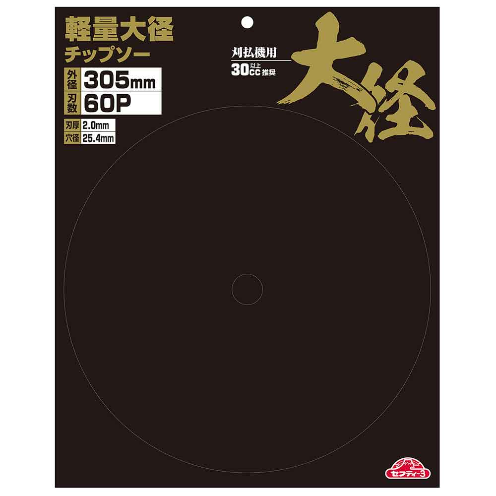 大型サイズの草刈用チップソーです。 草刈作業用。 従来の255mmチップソーに比べ作業効率アップ.します。 軽量設計で305mmでも軽く疲労も軽減します。 ●サイズ:305mm。 ●刃数:60。 ●推奨刈払機:30cc以上。
