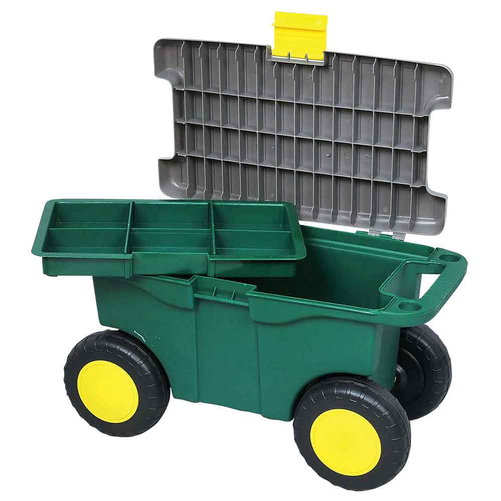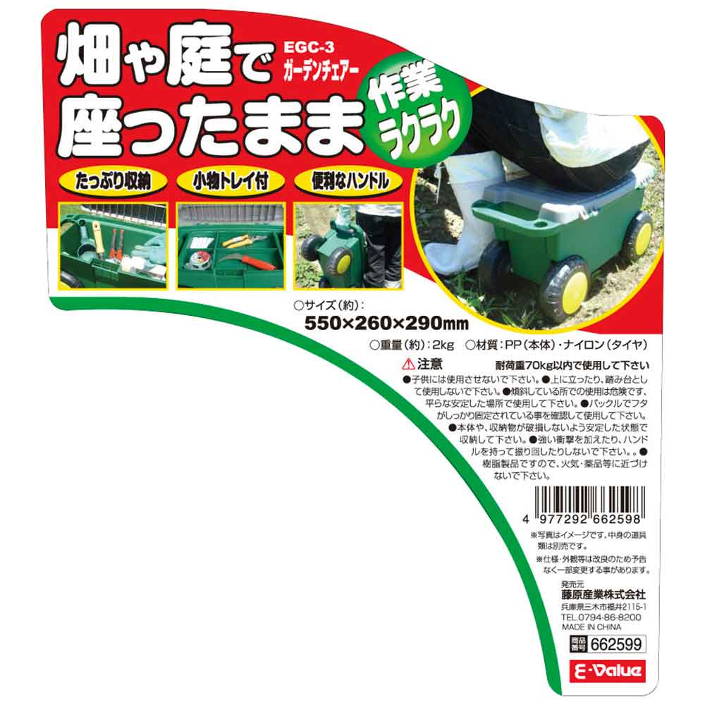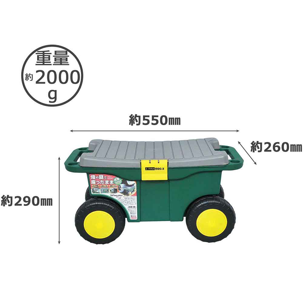 庭・畑まわりの作業が楽に出来ます。 タイヤ付き作業椅子。 4輪タイヤで移動性抜群で、畑の中の畝の間に移動に便利です。 庭まわりでの除草作業に便利です。 道具がしまえる収納フタ付きです。 小物に便利な中トレイ付きです。 持ち運びに便利なハンドル付きです。 ●サイズ:550X260X290mm。 ●重量:2000g。 ●耐荷重:70kg以内。 ●ハンドル付。 ●小物トレイ付。 ●内寸:約幅385X奥行205X高さ195mm(トレー厚み40mm)。