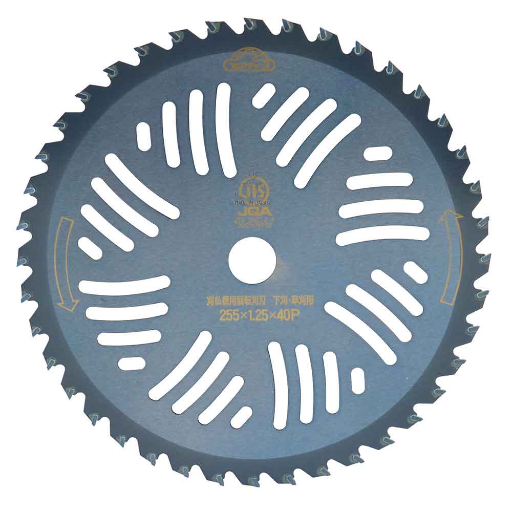 刈払機の安全カバーを適切に装着し、防災メガネ、ヘルメット、手袋、長袖、長ズボン、長靴を必ず着用して下さい。この刈刃は刈払機専用ですのでそれ以外の使用は絶対にしないで下さい。 作業用途に合ったチップソーを選定して下さい。特に雑草用のチップソーで灌木等の雑木は絶対に切断しないで下さい。チップソーにヒビ割れが無いか目立ては出来ているかよく確認して下さい。チップソーの締付けネジは確実に締付けて下さい。 刈払機を試運転し、ガタツキ、ブレなどがないかを点検し、安全を確認して下さい。横振れ、外周振れの大きなチップソーは1刃当たりの切断負荷のバランスがくずれ振動発生の原因となりますので刈払機メーカー指定外の大きな外径のチップソーと同じく絶対に使用しないで下さい。作業をする時は、周囲に人がいないことを確認して少なくとも周囲15メートル以内には人を近づけないようにして行ってください。