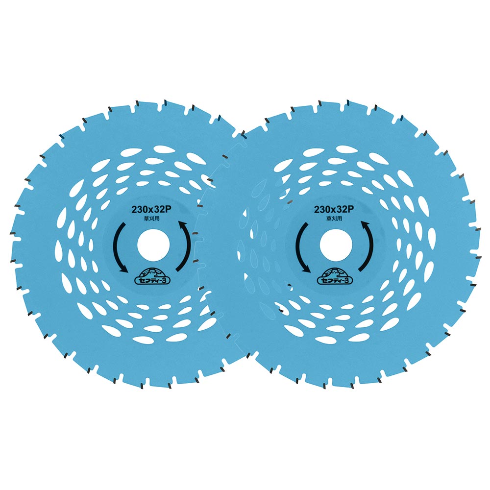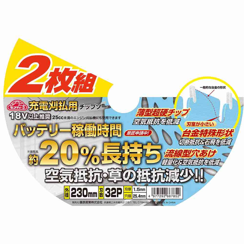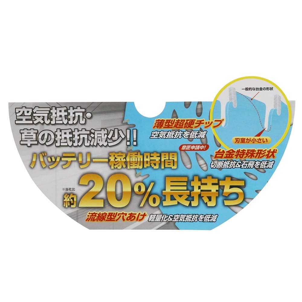 充電刈払機の稼働時間を伸ばす充電刈払用のチップソーです。 草刈り・刈払い作業。 空気抵抗削減+軽量化+耐久性を実現した新穴形状を搭載しました。 歯袋をなくすことで抵抗を減らしバッテリーへの負荷を軽減します。 超硬チップを薄くすることでより空気抵抗を少なくします。 抵抗削減構造により無負荷時約20%の稼働時間アップします(当社比)。 ●外径:230mm。 ●刃数:32P。 ●刃厚:1.5mm。 ●穴径:25.4mm。 ●台金厚:1.1mm。 ●推奨:充電式刈払機18V以上(25cc未満のエンジン刈払機にも使用可)。 ●2枚組。