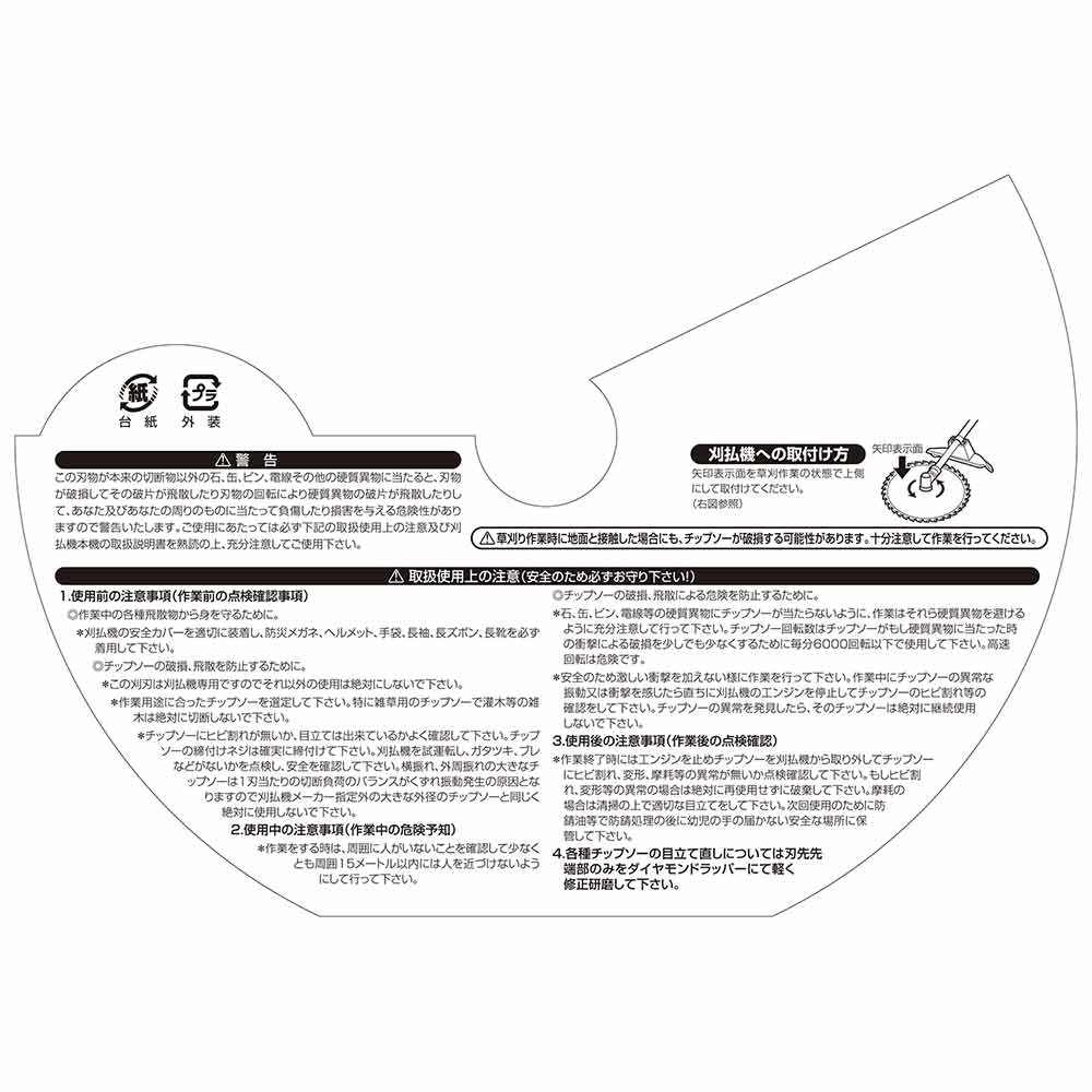 ご使用にあたっては必ず取扱使用上の注意及び刈払機本機の取扱説明書を熟読の上、充分注意してご使用ください。 刈払機の安全カバーを適切に装着し、防災メガネ、ヘルメット、手袋、長袖、長ズボン、長靴を必ず着用して下さい。 この刈刃は刈払機専用ですのでそれ以外の使用は絶対にしないで下さい。