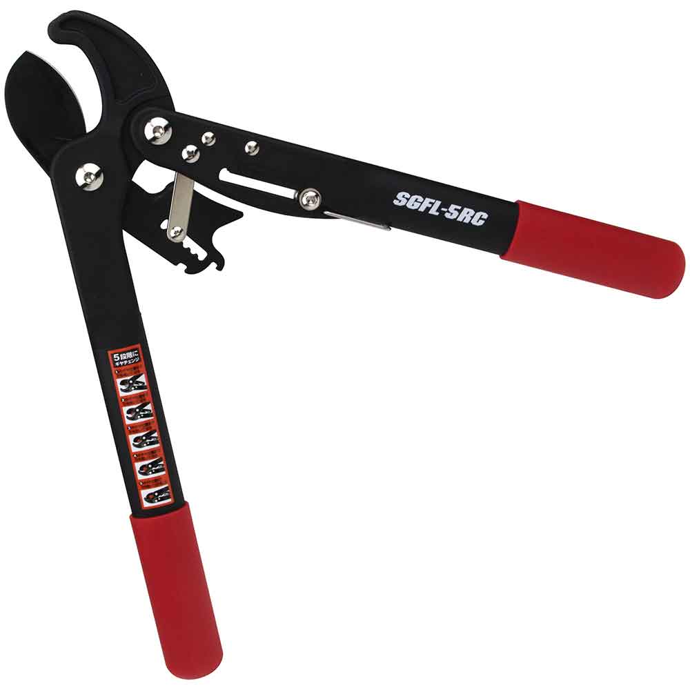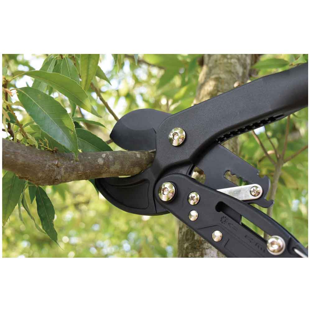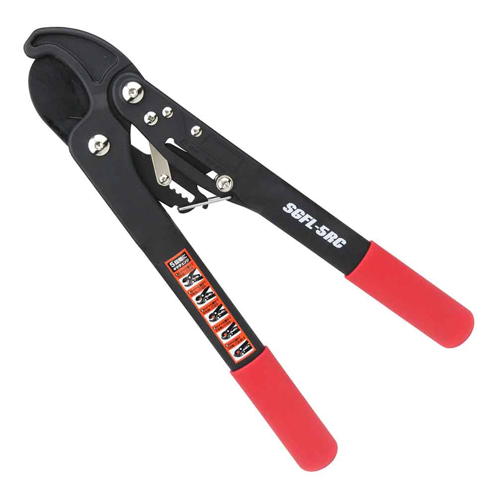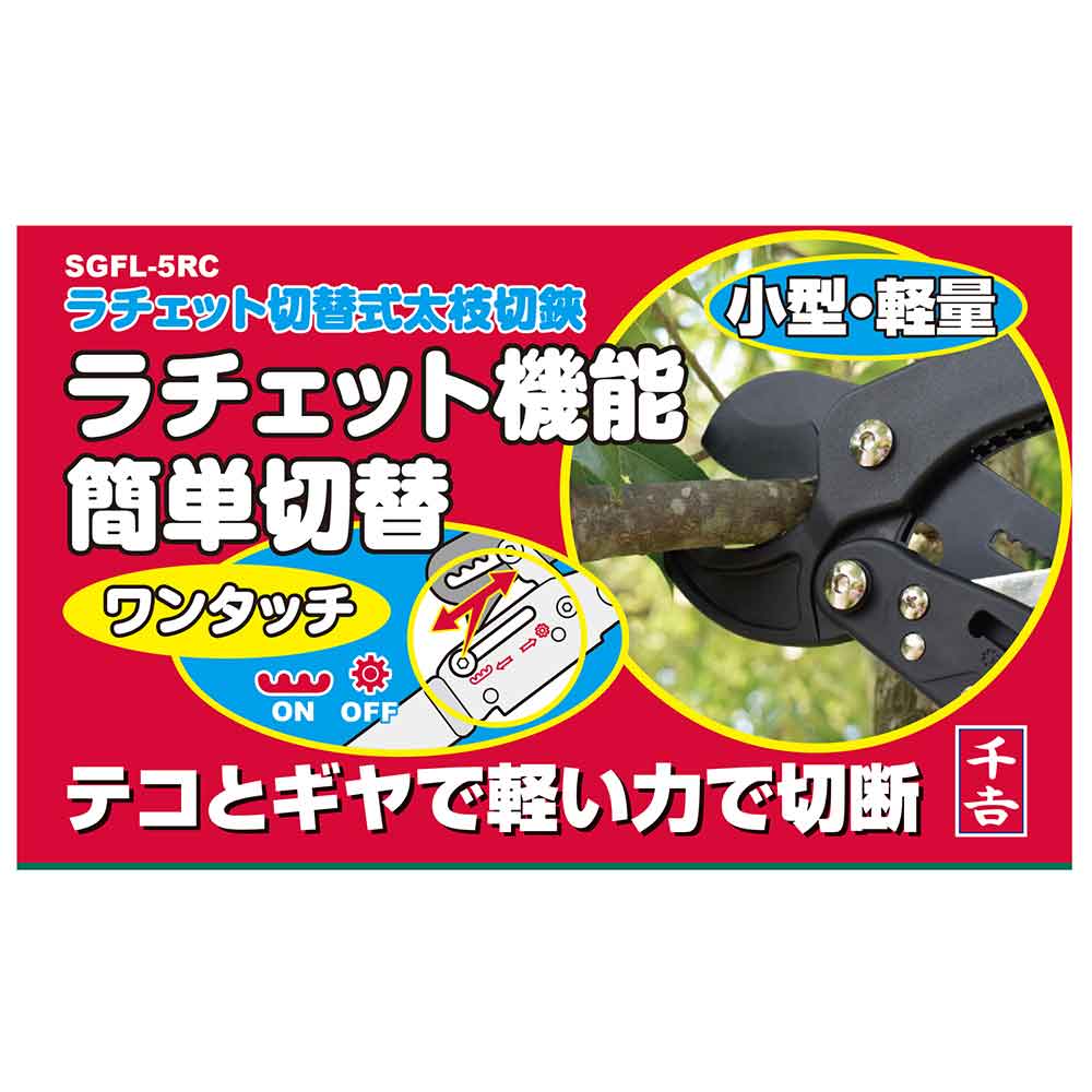 ラチェット式で太い枝も楽々切断ができる太枝切鋏です。 庭木の剪定作業用。 ラチェット機能式で、従来の約1/3の力で楽々切断ができます。 太い枝の切断、細い枝の連続切断等、シーンに合わせて使い分けが可能です。 ワンタッチでラチェット機能のオン・オフが切替られます。 錆び、ヤニ、汚れに強いフッ素コート加工刃です。 軽量、しかも丈夫なナイロングラスファイバー製ハンドルを採用しています。 ●切断目安:約30mm。 ●全長:約415mm。 ●重量:約550g。 ●硬度:HRC54±2。 ●刃の仕様:フッ素コート。