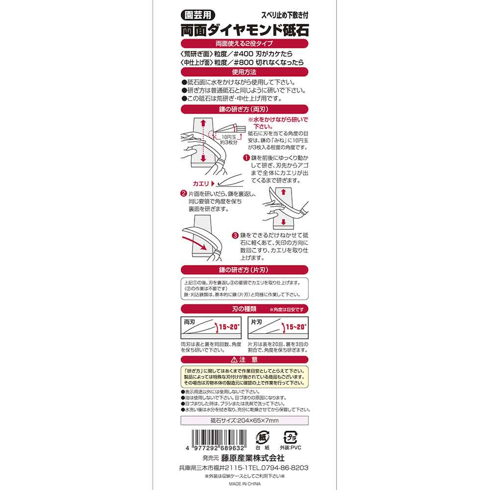 刃物研磨用のダイヤモンド砥石です。 砥石。 刃物研磨用のダイヤモンド砥石です。 ダイヤ砥粒で研削力が大幅にUPしています。 両面使える二役タイプです(荒、仕上げ)。 摩耗に強く耐久性抜群です。 すべり止め用の下敷き付きです。 ●荒研ぎ面400・仕上げ面800。 ●サイズ:204×65×7mm。