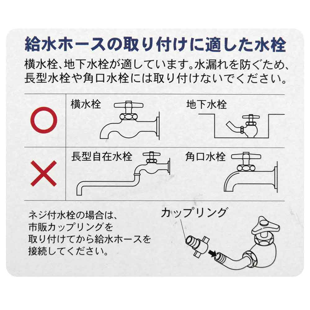 横水栓、地下水栓が適しています。 水漏れを防ぐため、長型水栓や角口水栓には取り付けないでください。 ネジ付水栓の場合は、市販カップリングを取り付けてから給水ホースを接続してください。