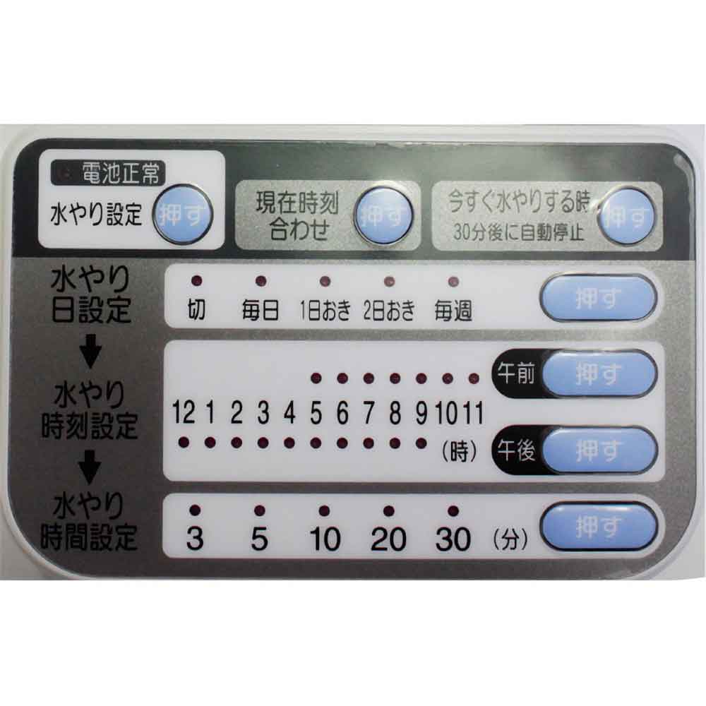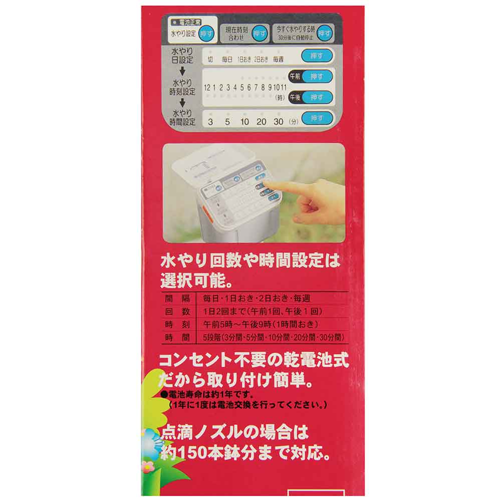 外出時も安心の自動水やりタイマーです。 芝生から鉢植え・畑などの水やり。 芝生から鉢植え畑まで自動で水やりができます。 別売品をご使用いただければ、場所と用途に合わせて自動水まきが可能です。 鉢・プランター、花壇・畑、芝生への水まきに最適です。 水やりの日、時刻、回数、時間の設定が可能です。 コンセント不要の乾電池式なので取り付けが簡単です。 ●電源:DC6V・単3電池4本。 ●水やり日:4日隔(毎日・1日おき・2日おき・毎週)。 ●水やり回数:2回/日(午前1回・午後1回)。 ●水やり時間:5段階(3分・5分・10分・20分・30分間)。 ●水流量:3~15L/分。 ●適合ホース:内径13~15mmX外径16~20mmの園芸用耐圧ホース。 ●付属品:ブラケット・ネジ2本・給水ホース・散水コネクター・給水アタッチメント・ホースバンド。