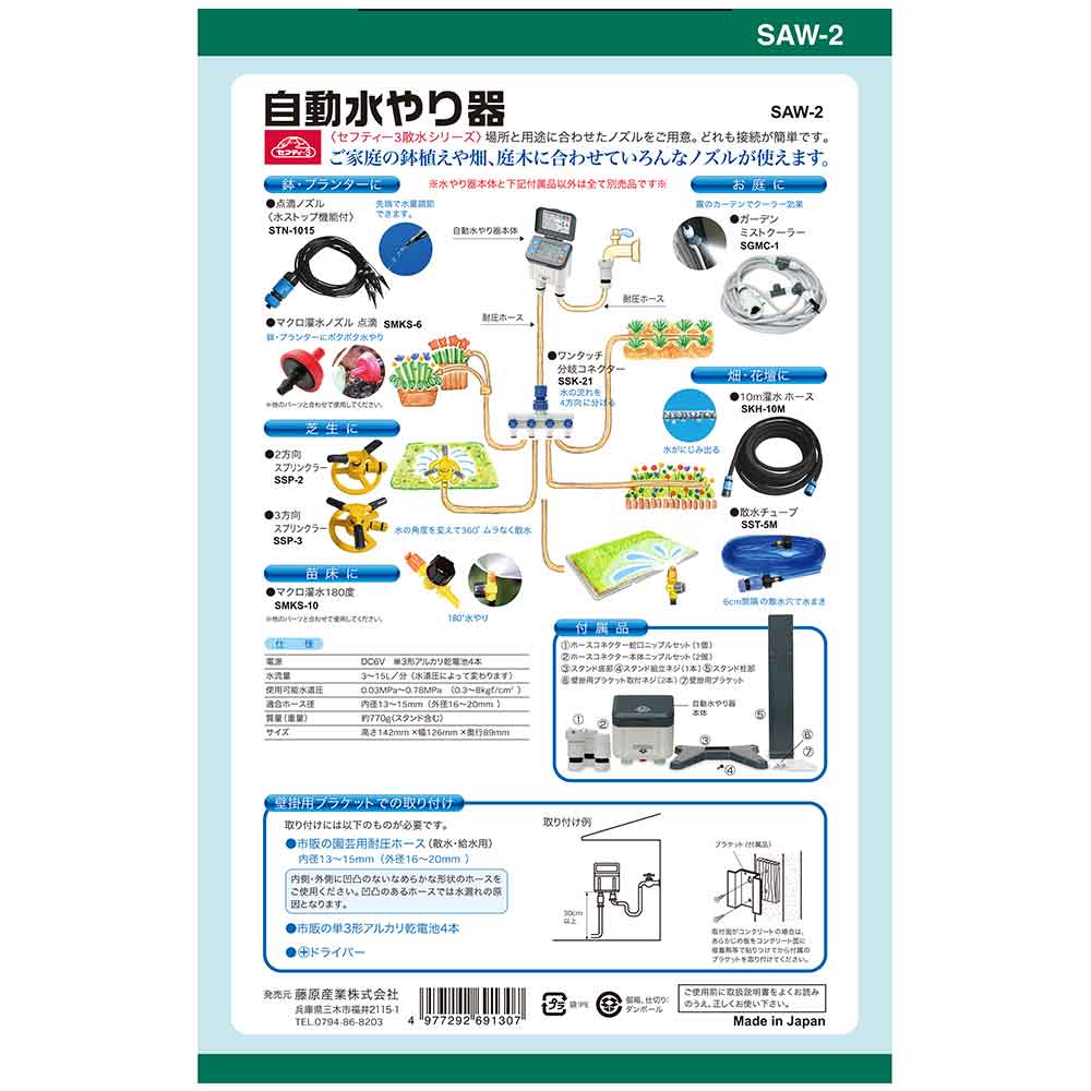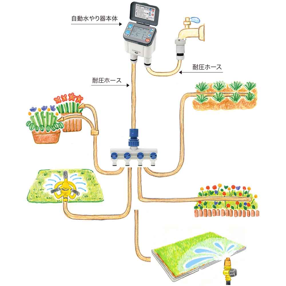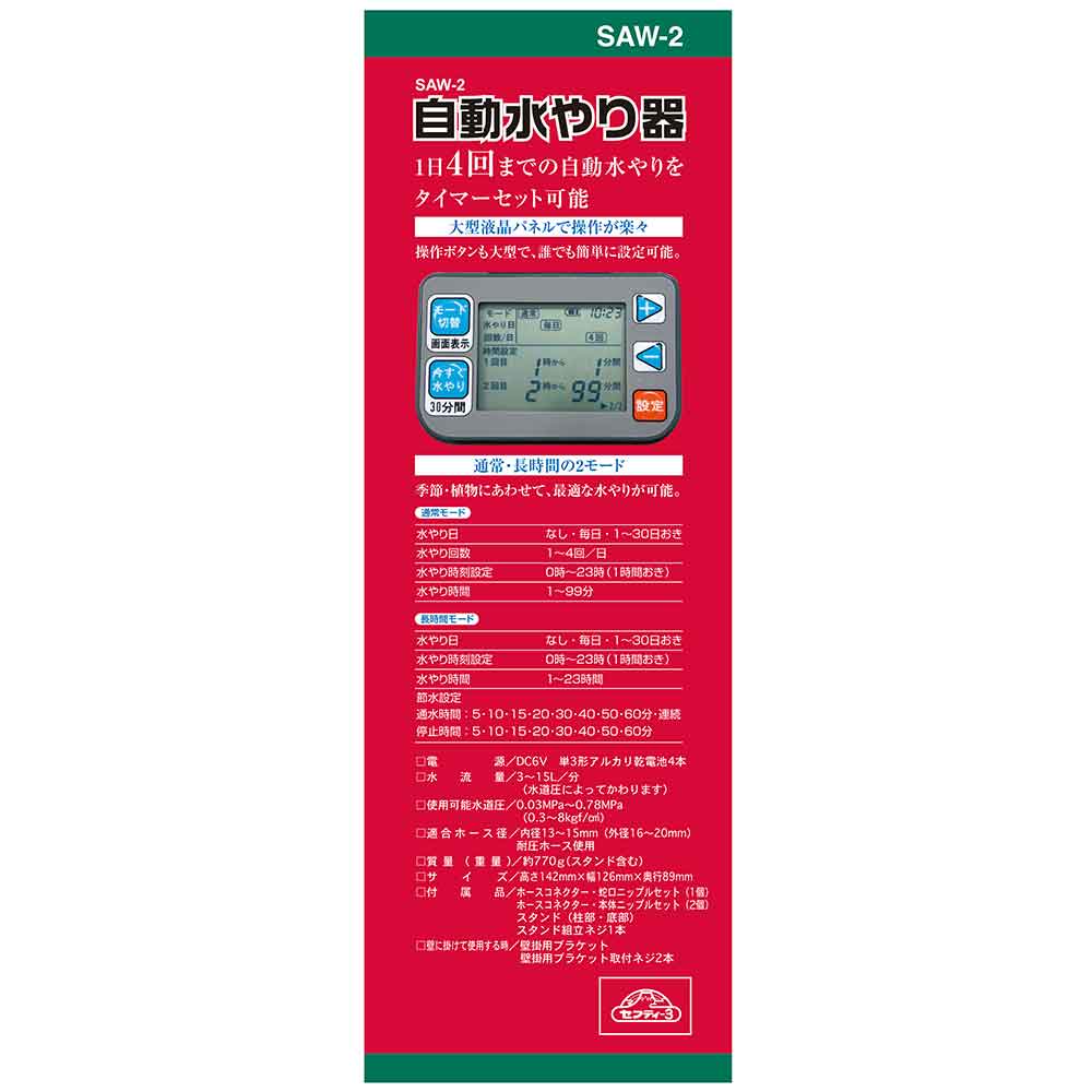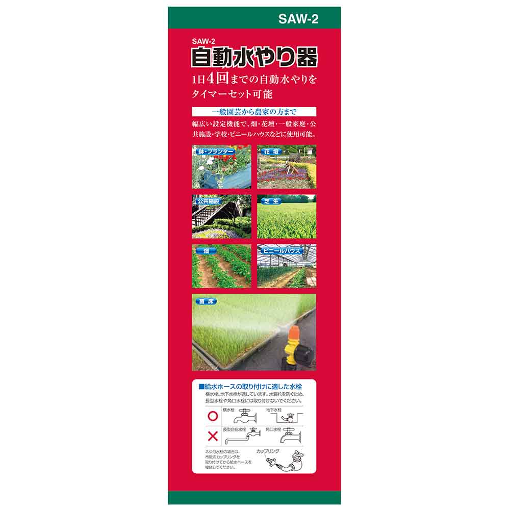 畑・花壇・芝生・一般家庭・公共施設・学校・ビニールハウス等での水やりに最適です。 水道栓につなぐだけで外出時の水やりも安心の簡単給水。 幅広い設定機能で一般園芸から農家の方まで使用可能です。 場所を選ばないスタンド標準で装備しおり、地下水栓にも対応しています。 今すぐ水やりボタンで設定時間以外でもすぐに水やり可能です。 ●通常・長時間モード共通(水やり日):なし・1~30日おき。 ●通常・長時間モード共通(水やり回数1日):1~4回。 ●通常・長時間モード共通(水やり時刻設定):0~23時(1時間おき)。 ●長時間モード通水:5・10・15・20・30・40・50・60分。 ●長時間モード停止:5・10・15・20・30・40・50・60分。 ●電源:DC6V単3形アルカリ電池4本。 ●水流量毎分:3~15L(水道圧によってかわります)。 ●適合ホース径:内径13~15mm・外径16~20mm。 ●付属品:ホースコネクター・蛇口ニップルセット(ホースコネクター・本体ニップルセット(2個)スタンド(柱部・低部)スタンド組立ネジ1本壁掛け用ブラケット・ネジ2本。