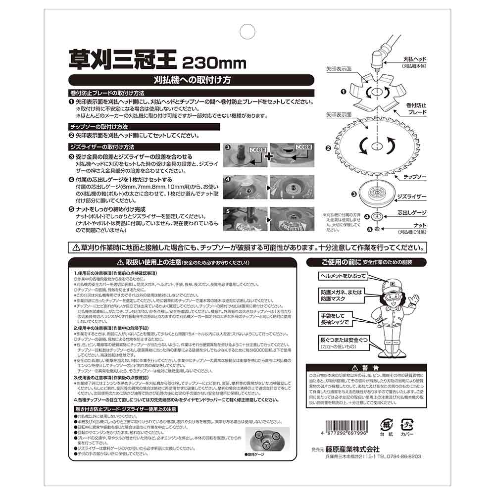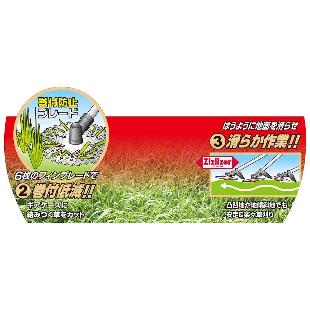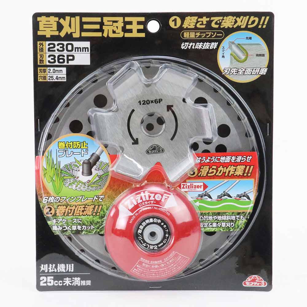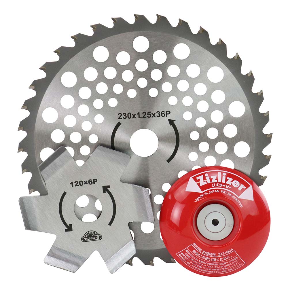 草刈作業を快適にする3点セットです。 草刈作業。 軽量タイプチップソーで刈払作業の負担を減らします。 6枚のフィンブレードが草の巻付・カラミを低減します。 地面を滑らせ楽に短く草刈り作業が可能になります。 ●サイズ:230mm。 ●巻き付き防止ブレードサイズ:120mm×0.8mm×6P。 ●ジズライザーサイズ:幅径100×高20mm。