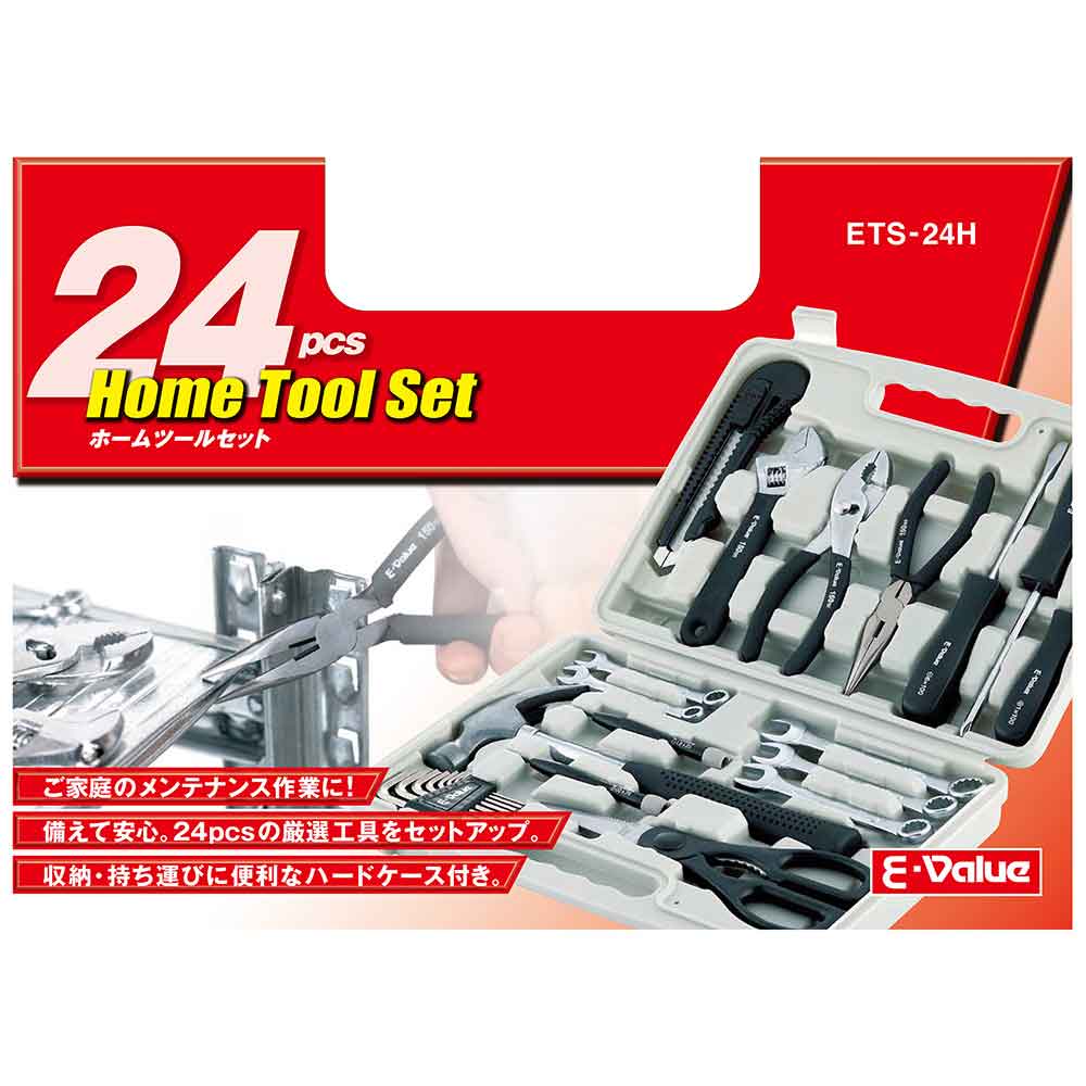 ご家庭でのメンテナンス作業に最適な24pcsをセットしました。 家庭・事務所等におけるメンテナンス作業。 備えて安心、24pcsの厳選工具をセットアップしました。 収納・持ち運びに便利なハードケース付です。 ●24点組。 ●セット内容:ドライバー(+1x100mm・+2x100mm・-6x100mm)・カッターL・ラジオペンチ150mm。 ●セット内容:コンビネーションプライヤー150mm・モンキーレンチ150mm・家庭用はさみ・ネールハンマー。 ●セット内容:六角棒レンチ(1.5・2・2.5・3・4・5・5.5・6mm)・精密ドライバー(-1.8・+00)。 ●セット内容:コンビネーションレンチ(8・10・12・13・14mm)・ハードケース。