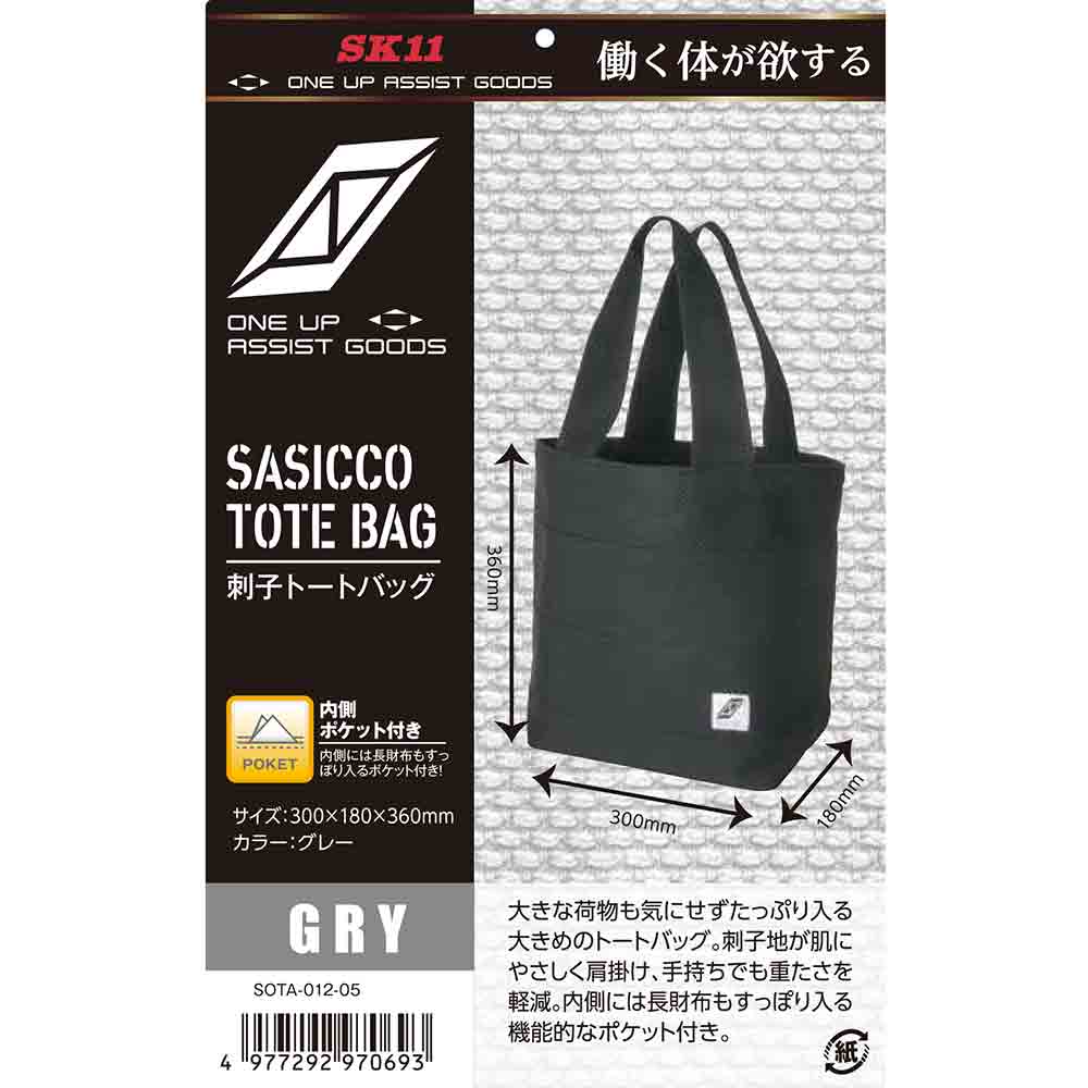 大きな荷物も気にせずたっぷり入る大きめのトートバッグです。 トートバッグ。 刺子地が肌にやさしく、肩掛けしても手持ちでも重たさを軽減します。 内側には長財布もすっぽり入る機能的なポケット付きです。 普段使いにも最適なバッグです。 ●サイズ:幅300×奥行180×高さ360mm。 ●色:グレー。