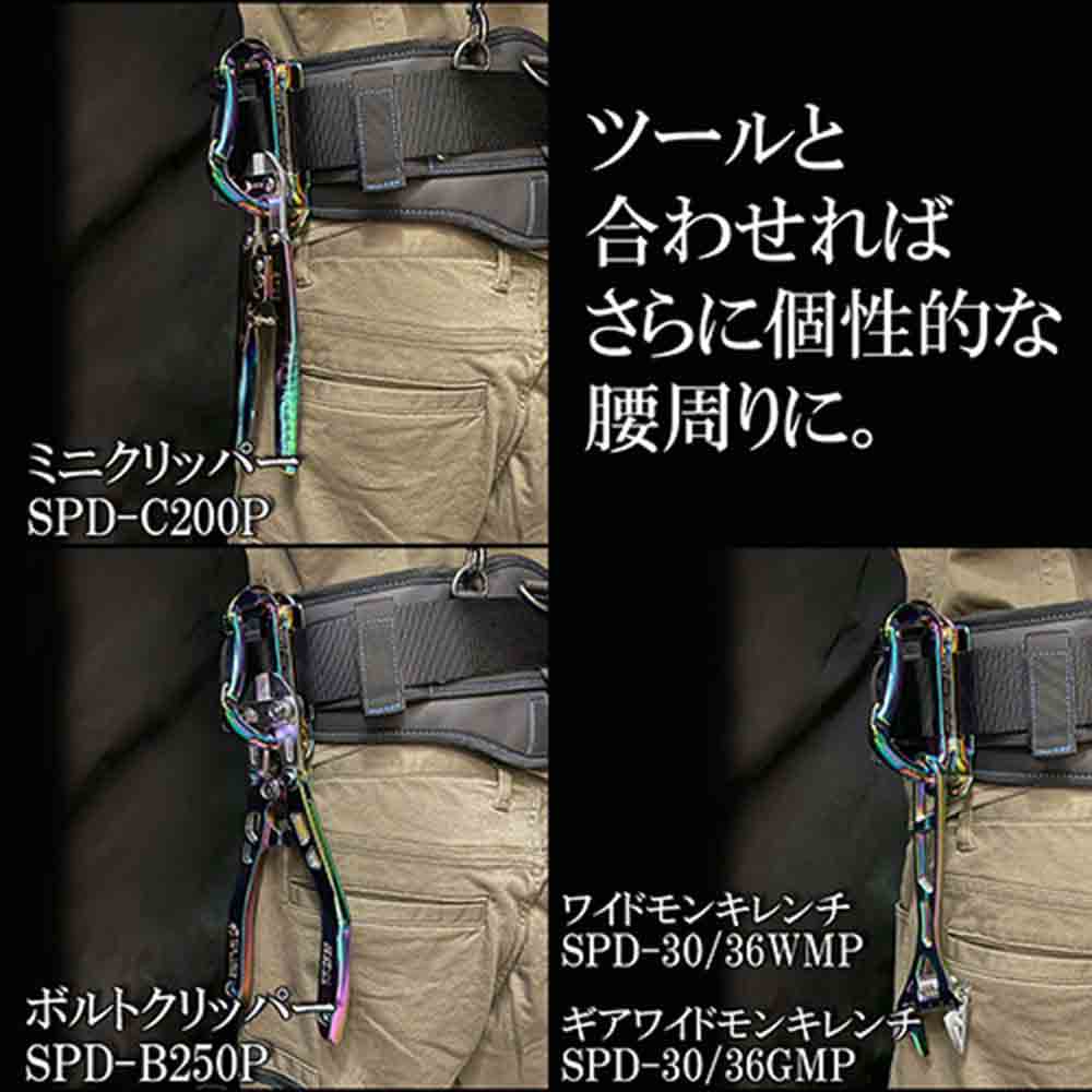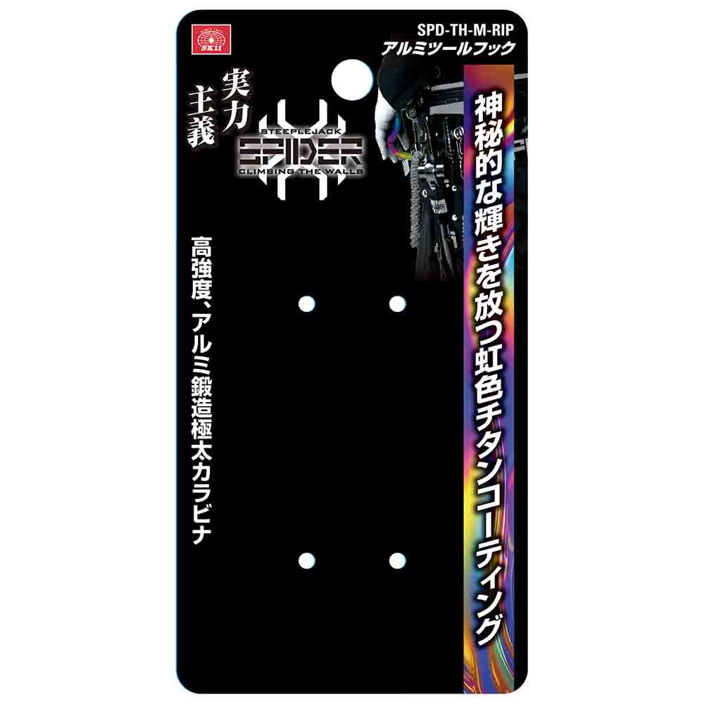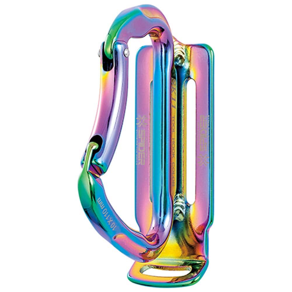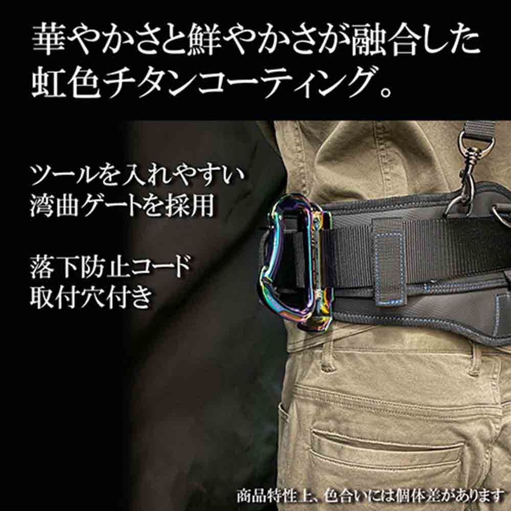 神秘的な輝きを放つ虹色チタンコーティングが施されたツールフックです。 ツールの携帯。 湾曲ゲートで工具をカツンとつりさげれます。 ●サイズ(約):幅40mm×高さ120mm×奥行75mm。 ●高強度アルミ鍛造極太カラビナ。