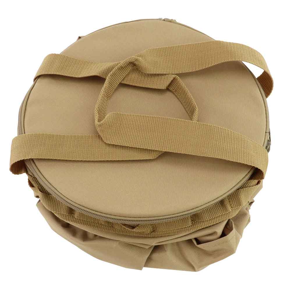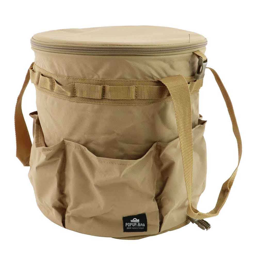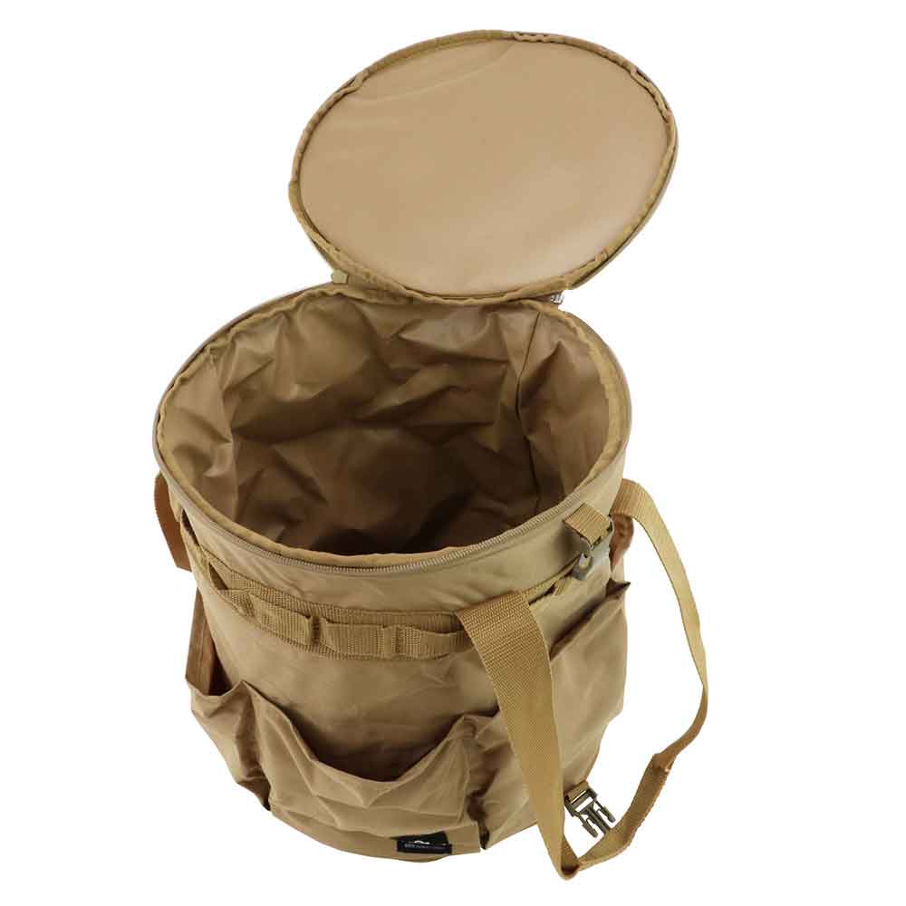 スプリングで自立、コンパクトにたためます。 工具、アウトドアギアの収納・持運び。 カラビナなど取り付け可能なベルト付きです。 取り外し可能なフタです。 外側ポケットが6個ついています。 ●カラー:コヨーテ。