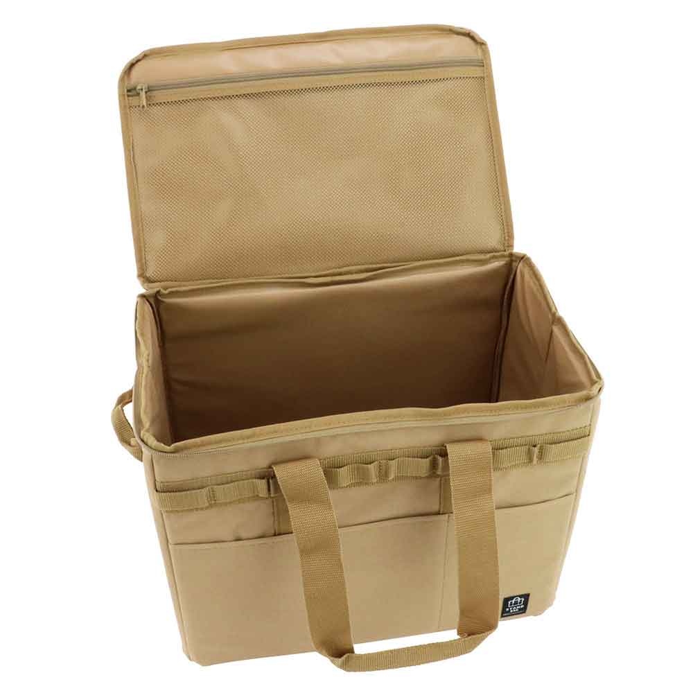 組み立て簡単、コンパクトにたためます。 工具、アウトドアギアの収納・持運び。 カラビナなど取り付け可能なベルト付きです。 持ち運びに便利なサイド取っ手付きです。 外側ポケットが6個ついています。 ●カラー:コヨーテ。