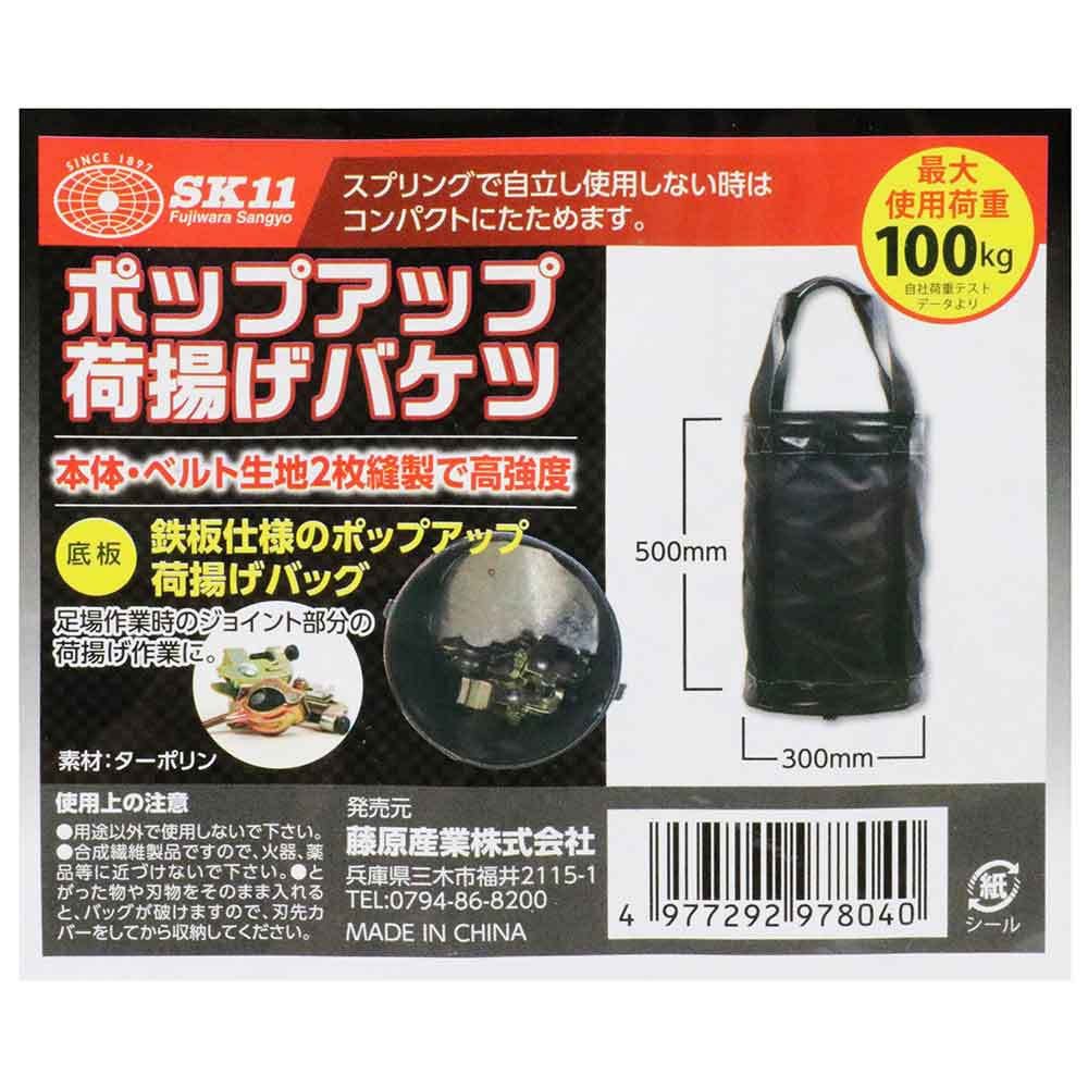 底板が鉄板仕様のポップアップ荷揚げバケツです。 足場組立作業のジョイント部分の荷揚げ作業。 本体・ベルト生地2枚縫製で高強度です。 ●サイズ:W300×H500mm。 ●最大使用荷重:100kg。