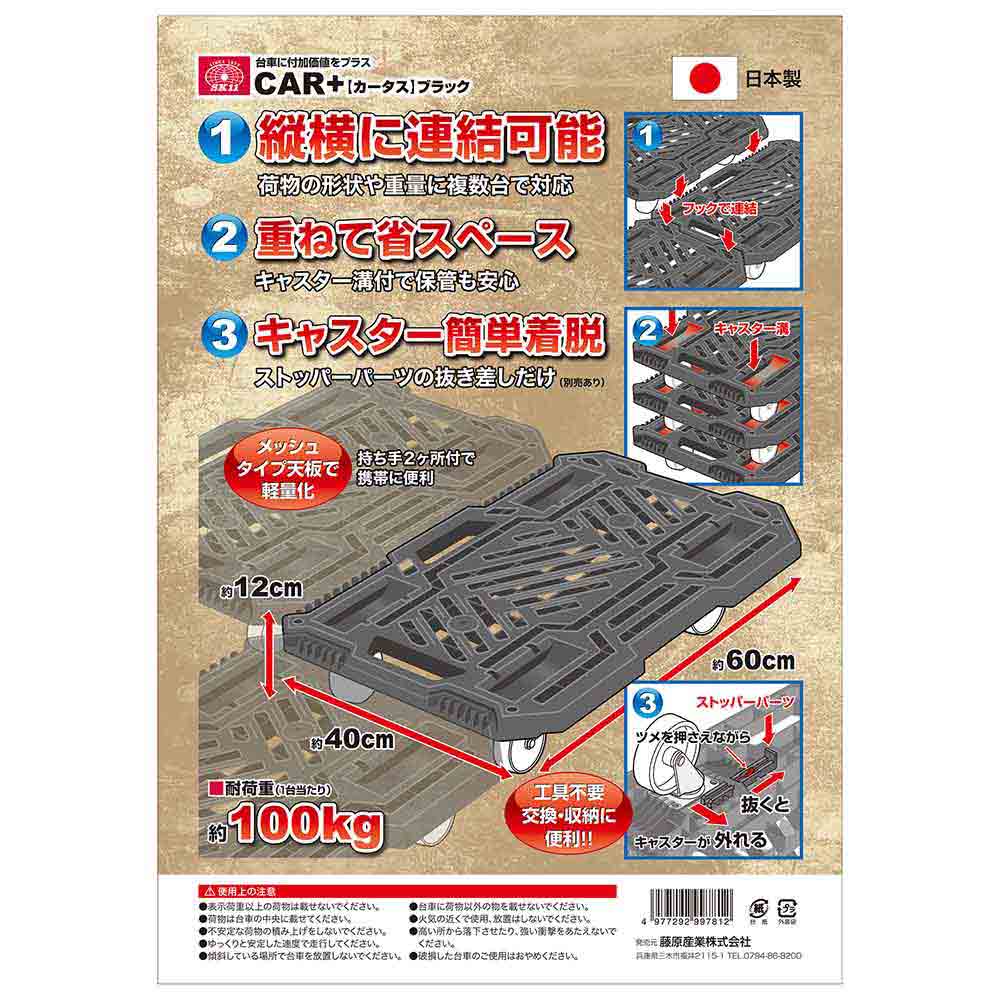 縦横連結可能な軽量タイプです。 荷物の運搬。 縦横に連結可能です。 保管は重ねられるので省スペース保管が可能です。 キャスターの交換が可能で、しかも簡単に脱着できます。 ●耐荷重役:100kg。 ●自重:約2.2kg。