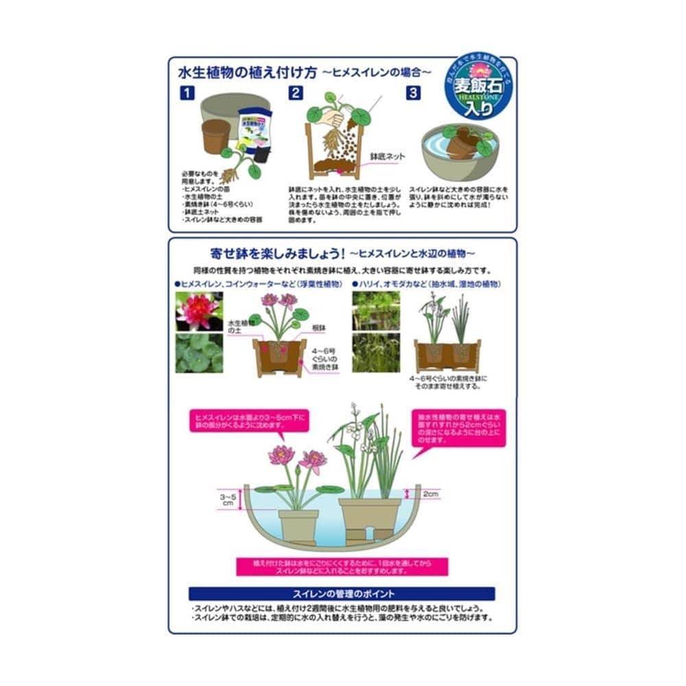 用土が粒状で植えつけやすい。水中でしっかり根を支える水生植物専用土。
