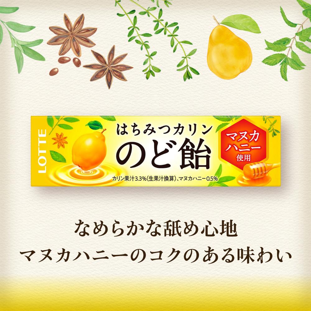 国産カリンエキスをはじめ、13種ハーブエキスと国産はちみつ、素材おいしさを1粒に詰め込んだのど飴。
