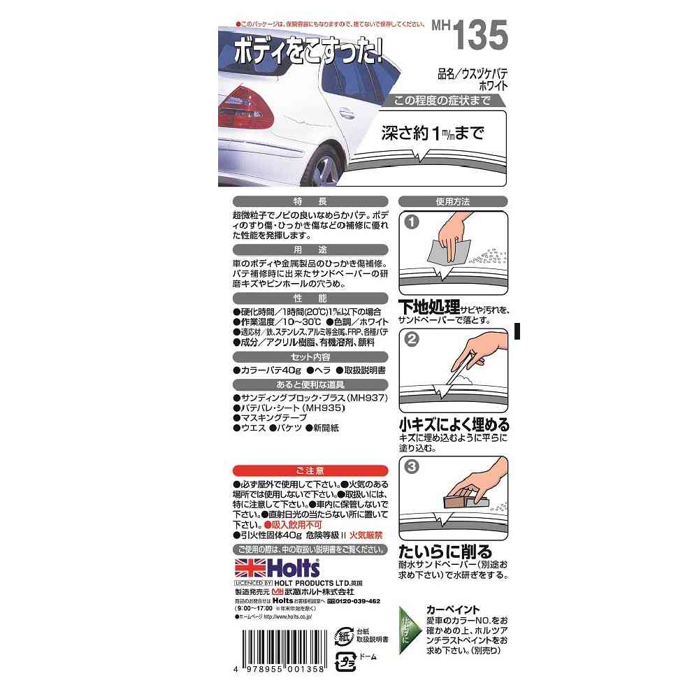 超微粒子でノビの良いなめらかパテ。 ボディのすり傷・ひっかき傷などの補修に優れた性能を発揮します。
