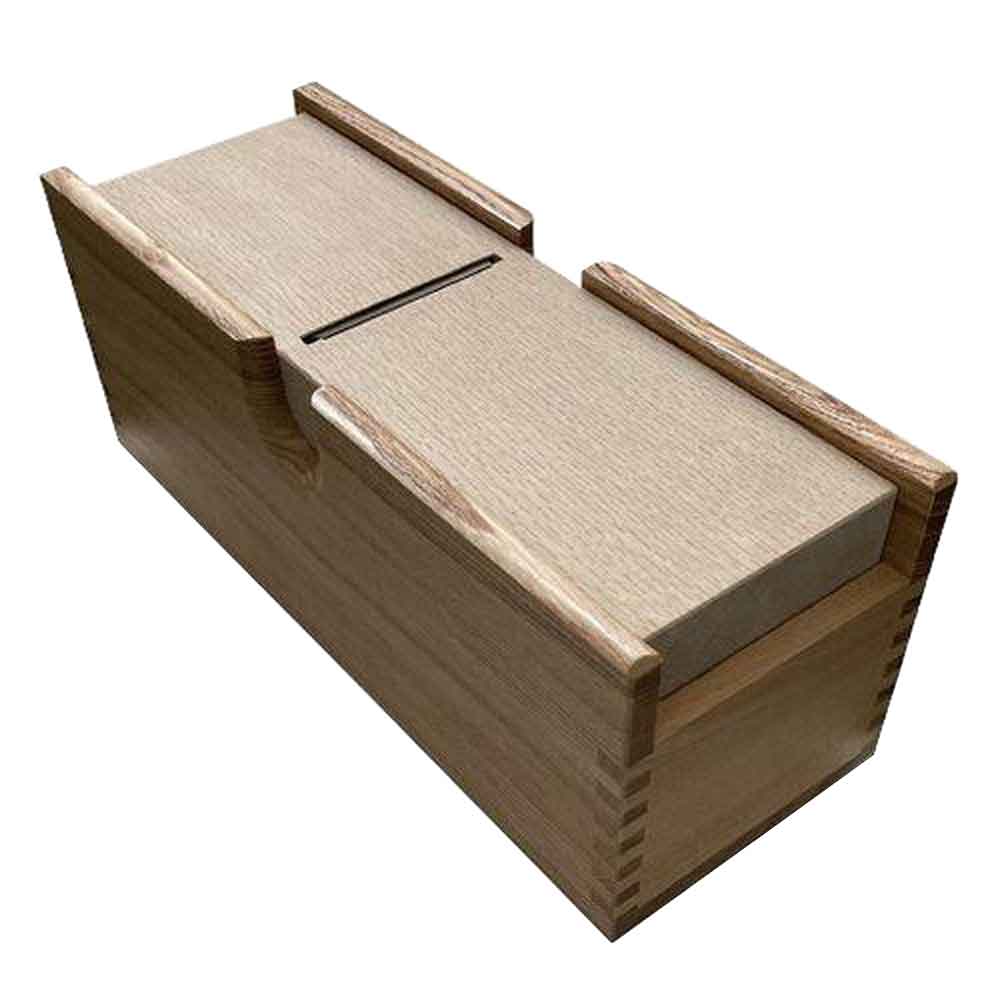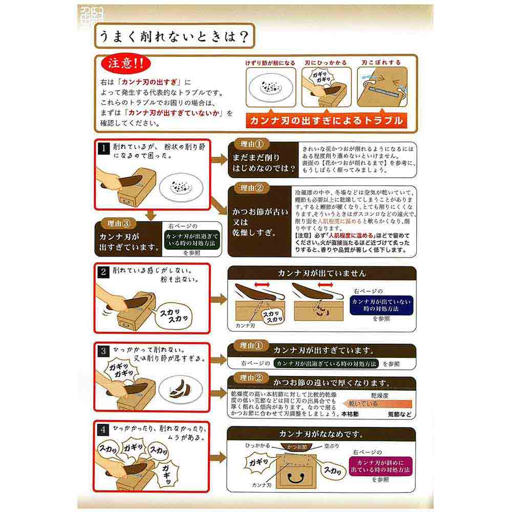 打ち刃物の町与板の職人が作った鉋刃を使用しておりスムーズな切れ味です。 鰹節(本枯れ節)削り。 引き出しが無い分、重く切れ味のいい鉋刃を使用でき多量の鰹節を削ることができます。 鉋の刃の調整は木槌を使用します。 鉋の刃を出す場合は鉋刃の上部を叩き、鉋の刃を引っ込める場合は台の上部を叩きます。 鉋の刃の出具合の目安はコピー用紙1枚分です。 刃が出すぎていると粉になりやすいです。 ●本体サイズ:幅111mm×高さ118mm×奥行302mm。 ●重量:約2000g。 ●鉋サイズ:70mm。 ●台の長さ:282mm。 ●台の高さ:70mm。
