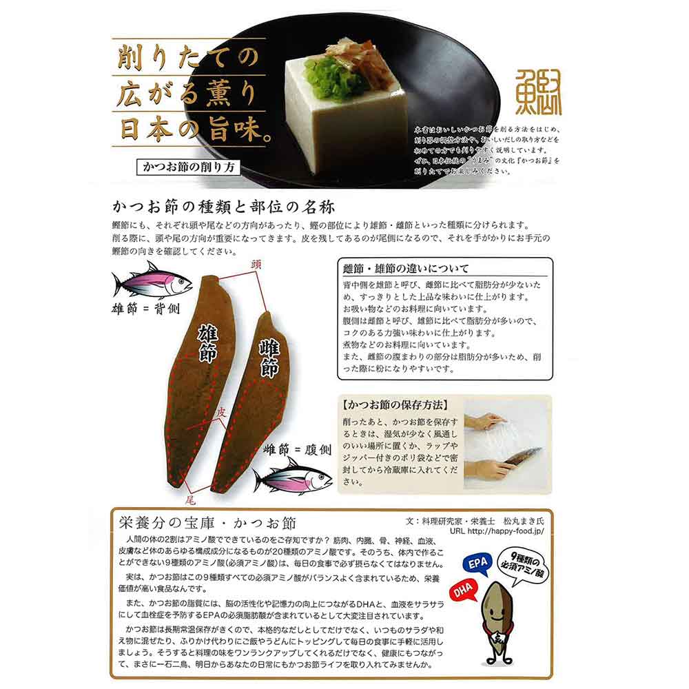 鰹節は頭側から削り、尻尾側をやや持ち上げて斜めに削ります。 鰹節には一面だけ皮が付いているので、その皮を常に見るような方向で削ります。 新しい鰹節を削る場合は、削り面が平らになるまでは粉になりやすいので、根気強く平面が出来るまで削りましょう。