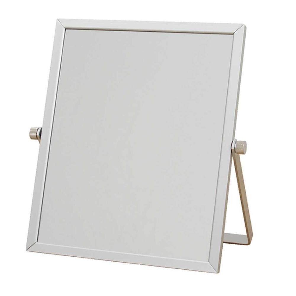 スタイリッシュなアルミ製フレームを使用したシルバーのスタンドミラー。 足の開きを変えることで鏡の角度を調整出来ます。 卓上鏡としては小さめサイズなので会社のデスクに置いても、お出かけに携帯してもいいミラーです。 足のネジが緩んでも手で締めることが出来るのもいいところです。