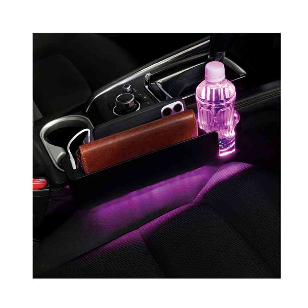●内側も外側も光るシートサイドポケットです。 ●光の色を9色+グラデーションモード(9色がゆっくりと順番に自動で切り替わる)から選択することができるLEDイルミを搭載しています。 ●明るさの調節が可能です。 ●色と明るさを記憶するメモリー機能を搭載しています。 ●ドリンク・長財布・大型スマホ等を置くことができます。 ●充電用USB TYPE-AポートとUSB TYPE-Cポートを搭載しています。 ●2個の取付ステーと2種類の厚みのクッションで、シートのすき間に合わせて装着可能です。 ●コード長:約1m