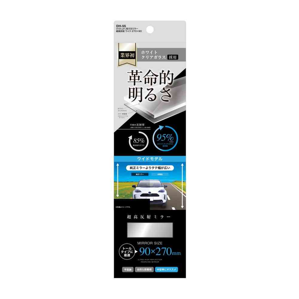 ●業界初、透明度の高いホワイトクリアガラス採用で、高反射鏡よりさらに明るく鮮明な超高反射鏡。 ●後方視界大幅アップ。後部座席までしっかり見える。 ●鏡面サイズ:270×90mm ●トールタイプのコンパクトカーに最適。 ●距離感のつかみやすい平面鏡。