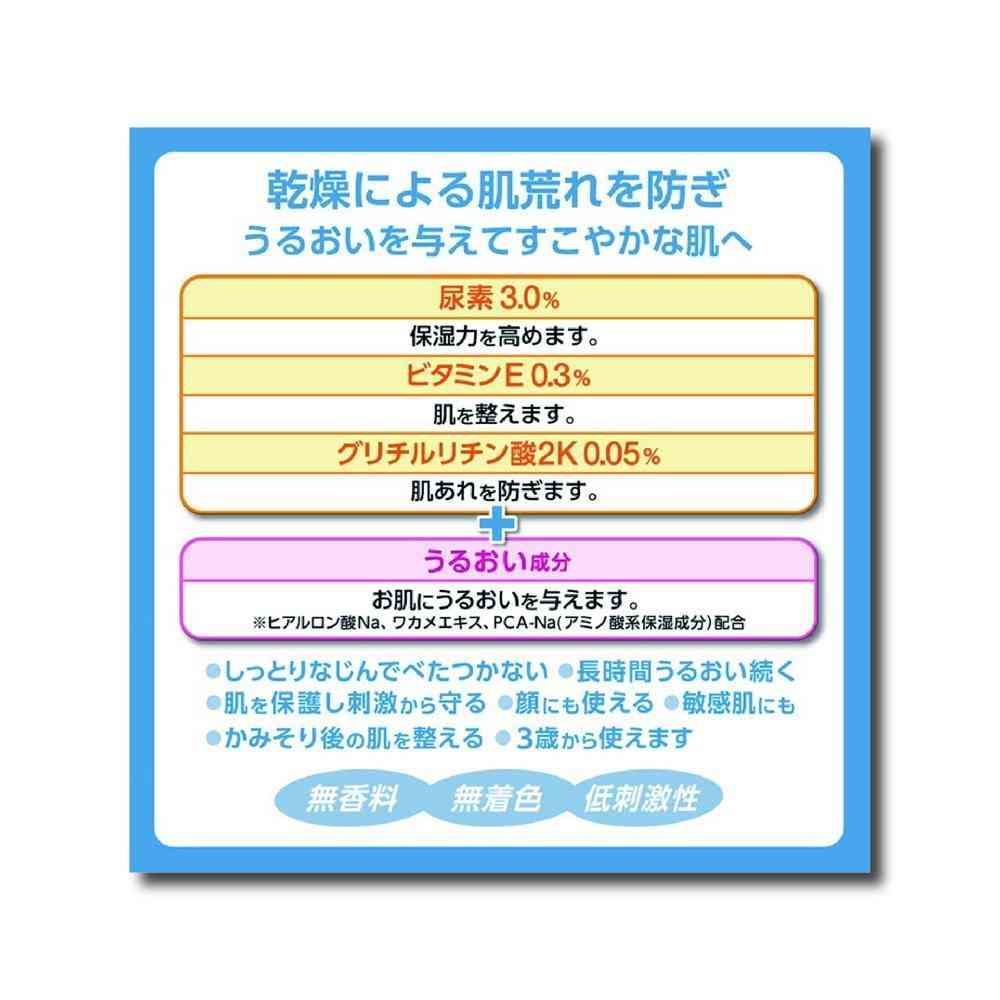 家族で使える、保湿、保護、ハンドケア、ボディケア、スキンケア、乾燥、肌あれ、無香料、無着色、尿素、ビタミンE、グリチルリチン酸2K、ヒアルロン酸Na、ワカメエキス、PCA-Na(アミノ酸系保湿成分)