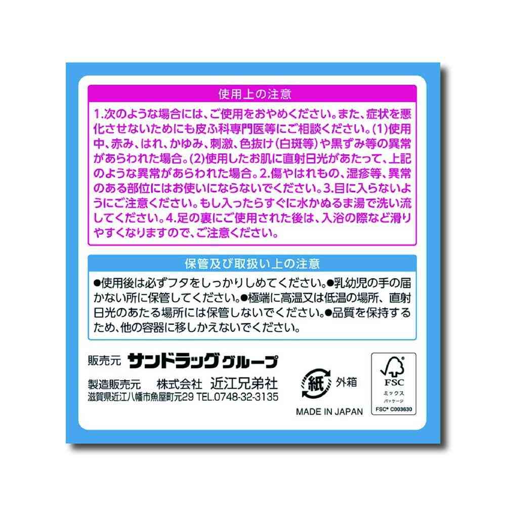 1.次のような場合には、ご使用をおやめください。また、症状を悪化させないためにも皮ふ科専門医等にご相談ください。 (1) 使用中、赤み、はれ、かゆみ、刺激、色抜け(白斑等)や黒ずみ等の異常があらわれた場合。 (2) 使用したお肌に直射日光があたって、上記のような異常があらわれた場合。 2.傷やはれもの、湿疹等、異常のある部位にはお使いにならないでください。 3.目に入らないようにご注意ください。もし入ったらすぐに水かぬるま湯で洗い流してください。 4.足の裏にご使用された後は、入浴の際など滑りやすくなりますので、ご注意ください。 乳幼児の手の届かない所に保管してください。 使用後は必ずフタをしっかりしめてください。 乳幼児の手の届かない所に保管してください。 極端な高温又は低温の場所、直射日光のあたる場所には保管しないでください。 品質を保持するため、他の容器に移しかえないでください。