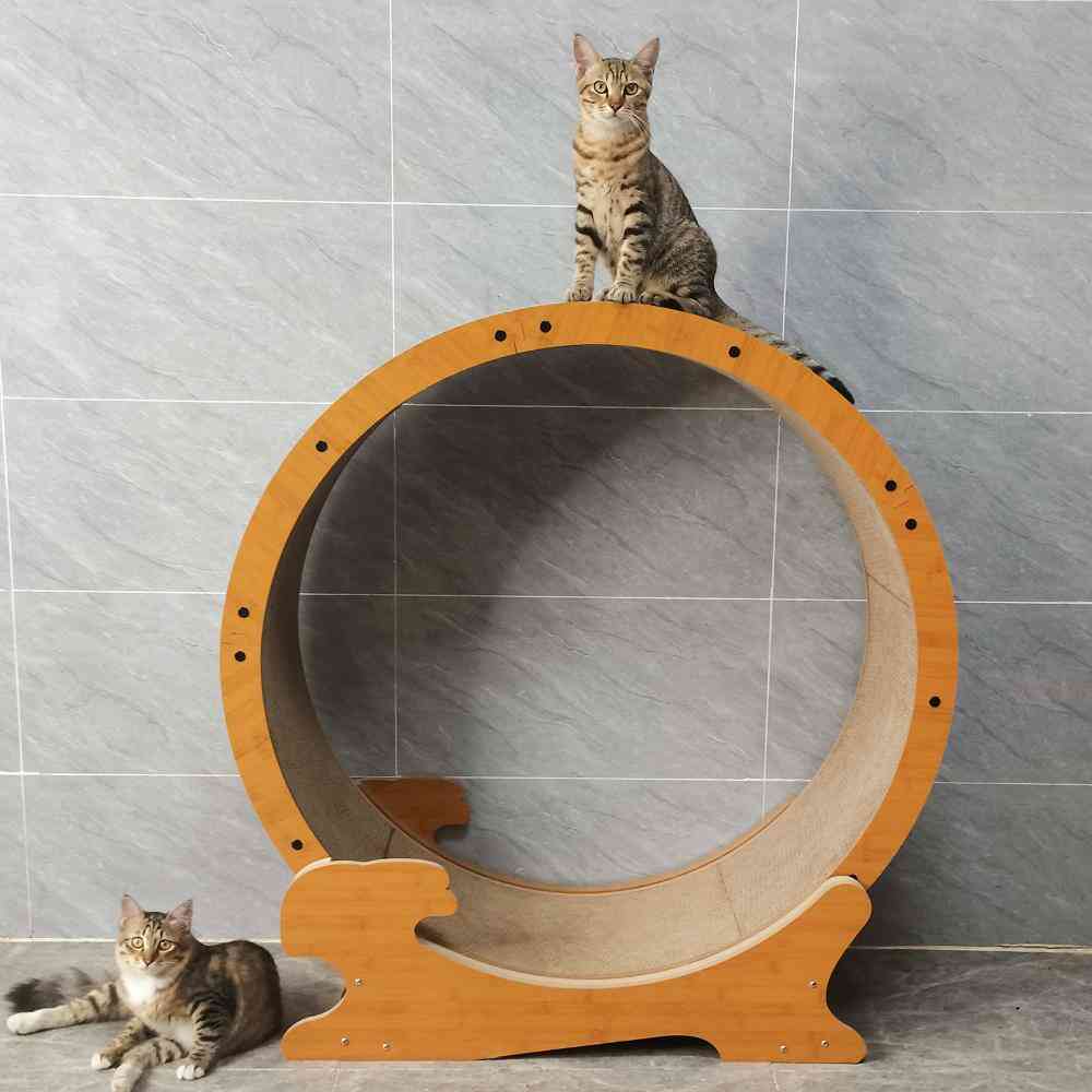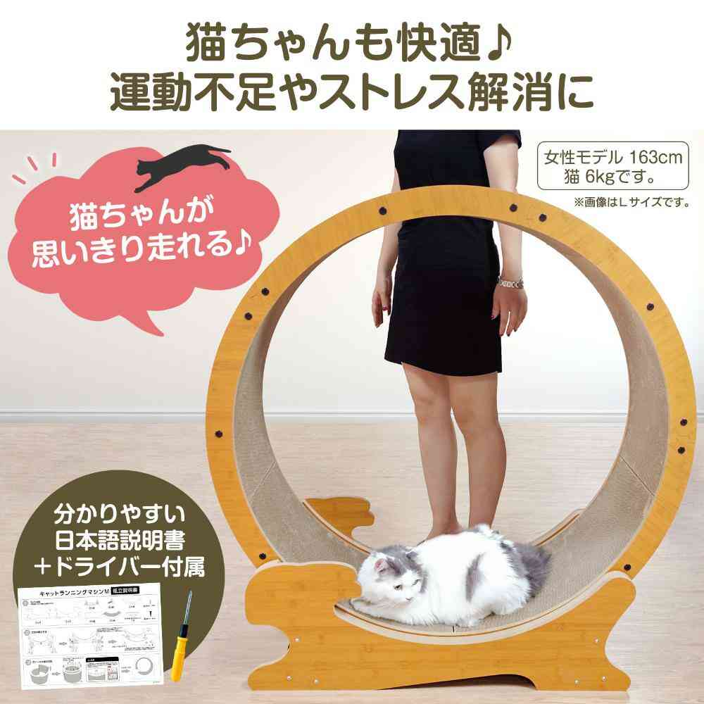 猫ちゃん用のランニングマシン。室内で生活する猫ちゃんの運動不足解消とストレス発散におすすめ。車輪の本体は段ボール製の爪とぎなので、車輪の中と外で爪とぎができます(別売りで替え爪とぎあり)。夜や外出時など必要な時は回らないように固定できるので、キャットタワーがわりにも使えます。幅約100cm、奥行約39cmと広々サイズで大型の猫ちゃんにもおすすめ。回る音が静かなので、集合住宅でも使えます。 ●耐荷重:20kg