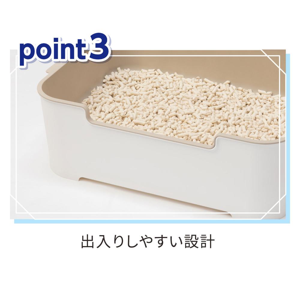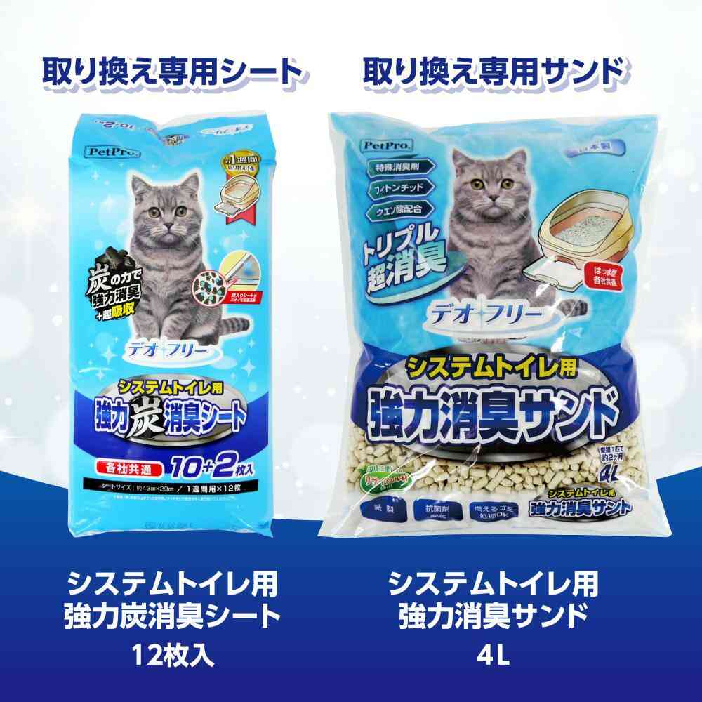 デオフリー強力消臭サンド2L(1か月分)とデオフリー強力炭消臭シート1枚(1週間分)付きのシステムトイレです。 【強力消臭サンド】天然の消臭成分(クエン酸、フィトンチッド)でオシッコのニオイを素早く消臭!はっ水タイプで足元サラサラ。抗菌剤配合でいつも清潔。 【強力炭消臭シート】炭入りシートがニオイを強力消臭。パワフル吸収で1週間取り替え不要です。サークルの中でも使えるコンパクトサイズ。 ・サークル内でのトイレのしつけに最適です。 ・子猫でも出入りがしやすい形状。 ・リビングに置いてもなじむナチュラルなカラー。 ・セット内容:トレー、スノコ、スコップ、強力消臭サンド2L(約1か月分)、強力炭消臭シート(約1週間分)