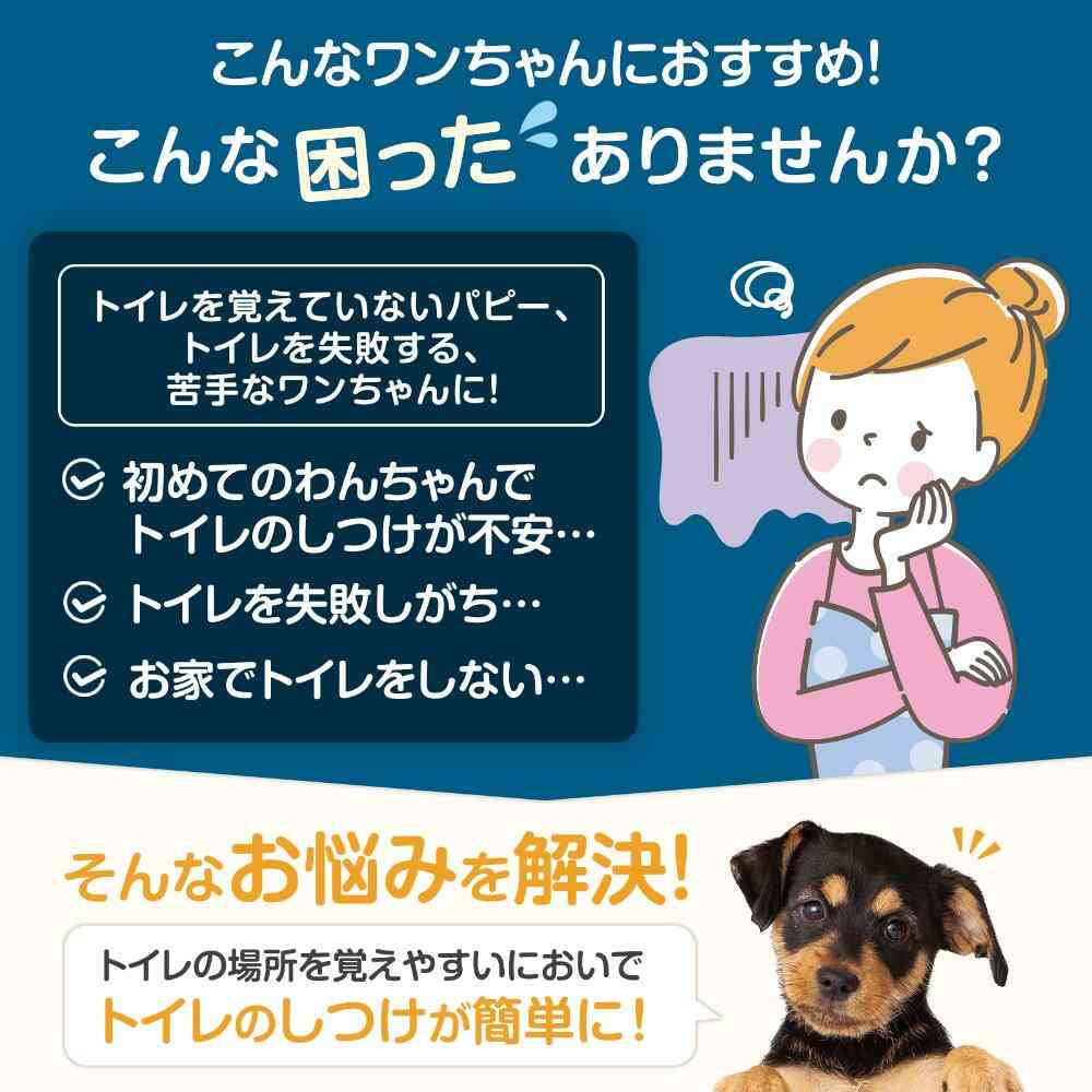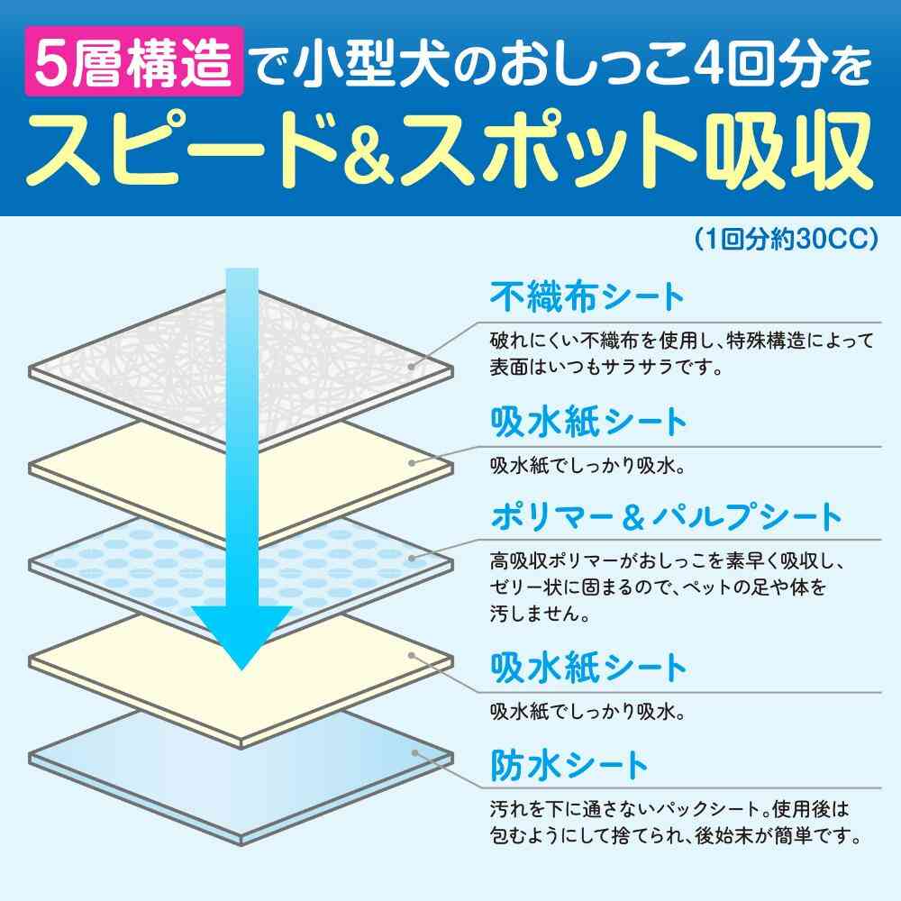 トイレの場所を覚えやすいニオイが1.2倍*!パピーのトイレトレーニングをサポートするシーツです。5層構造(不織布シート・吸水紙シート・ポリマー&パルプシート・吸水紙シート・防水シート)で小型犬のおしっこ4回分(1回約30cc)をスピード&スポット吸収。パッケージのQRコードから獣医師推奨のトイレトレーニング動画が見ることができます。幼犬だけでなく、成犬にもご使用いただけます。(*メーカー従来品との比較)