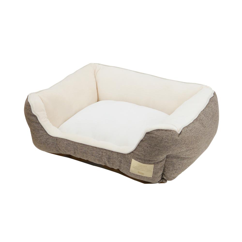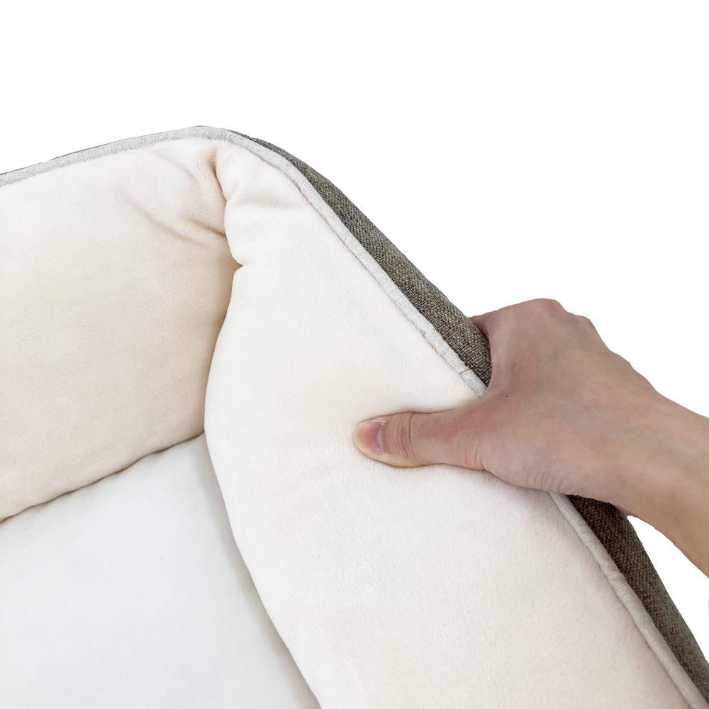 ・1年を通して使いやすい生地のスクエアベッドです。 ・インテリアに馴染みやすいデザインと色合いになっています。 ・内生地は手触りがよくオールシーズンで使えるふんわり短毛生地で、外生地は織生地です。 ・中型犬におすすめ。