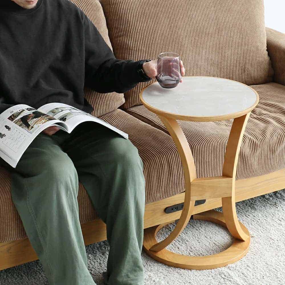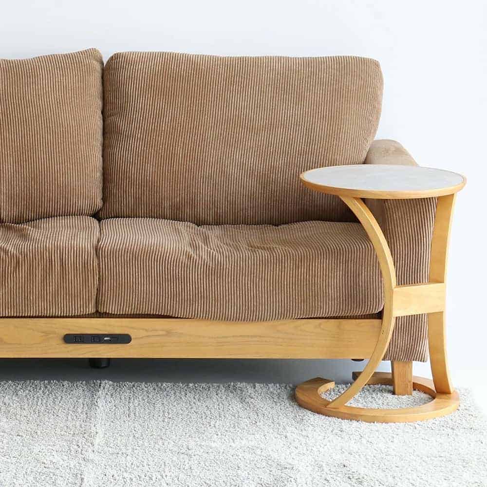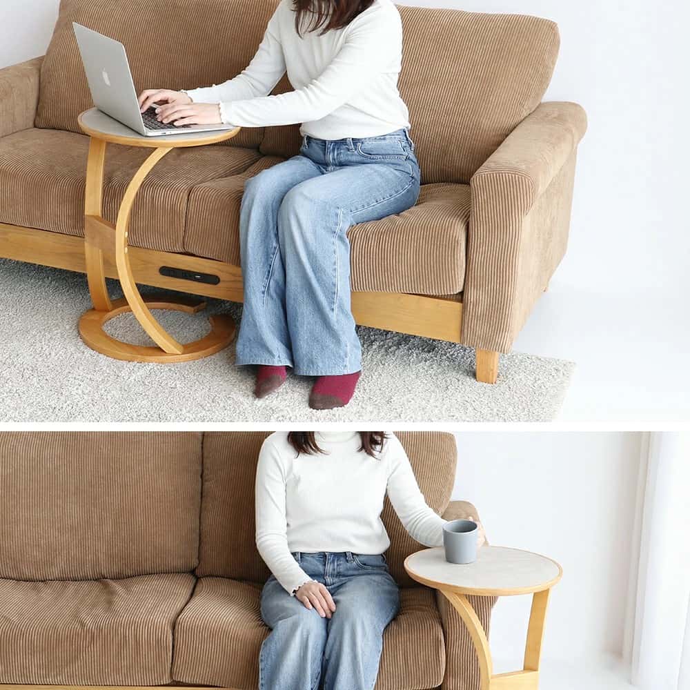 C字型の脚がソファの下にスッと入り、テーブルをぐっと手元まで。 くつろぎの時間を、もっと快適にしてくれるサイドテーブルです。 天板下の高さは約53cm。ソファー肘の高さがこれ以下であれば、 スッと差し込むことが可能です。
