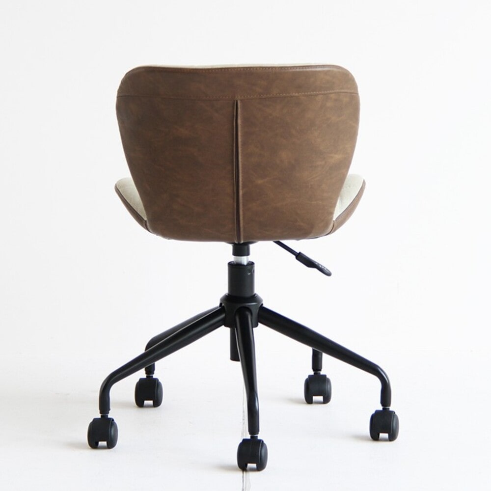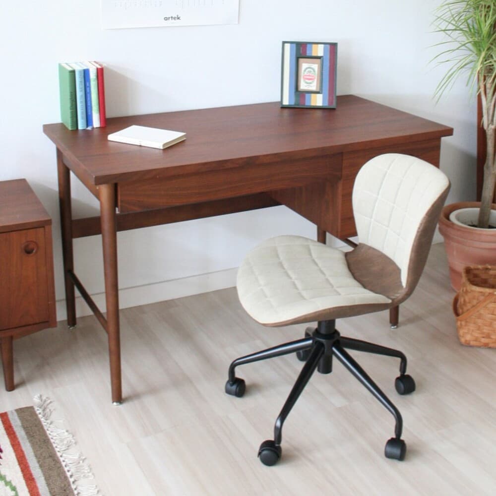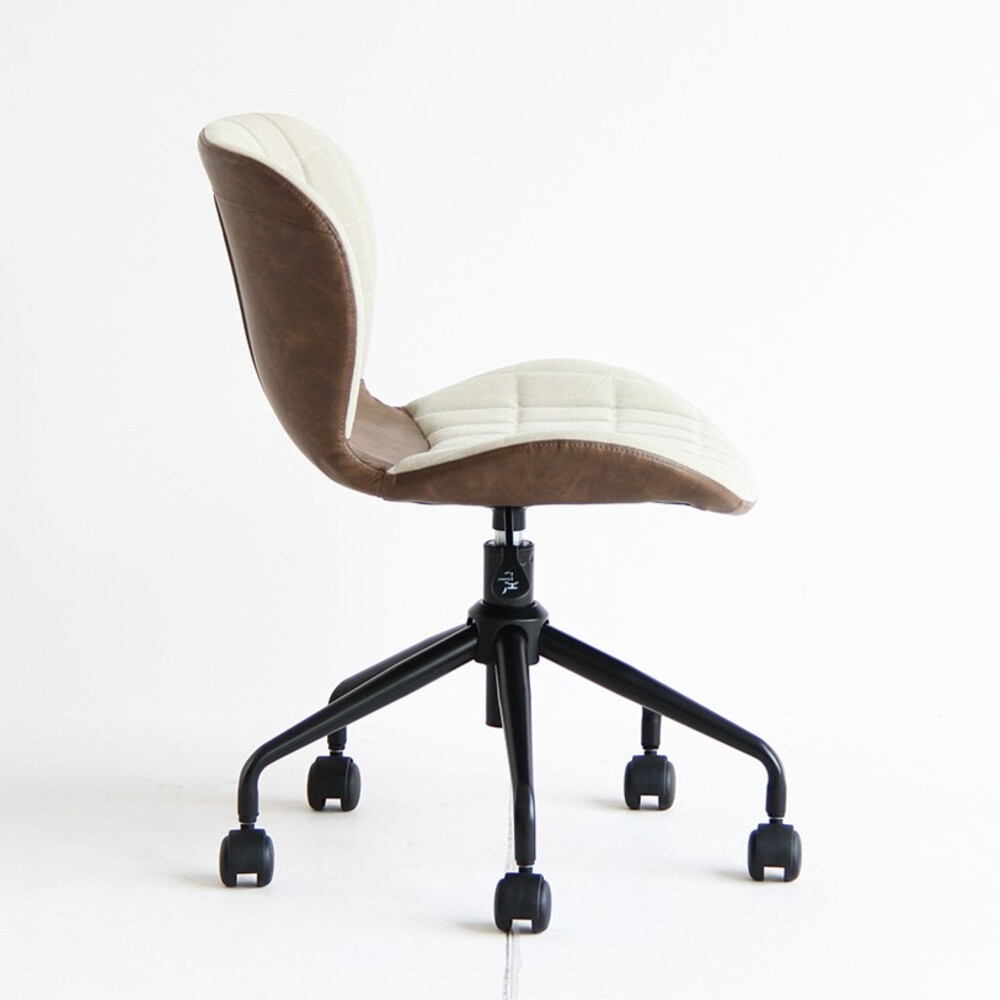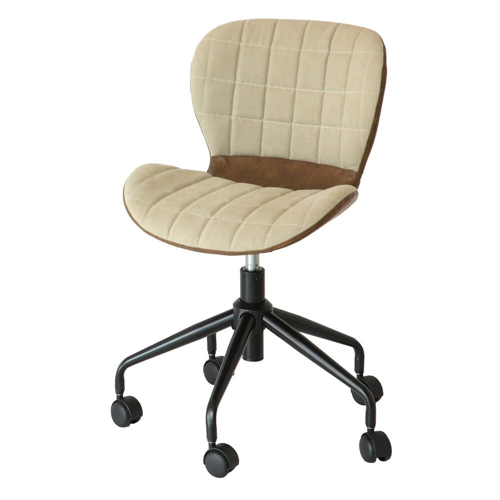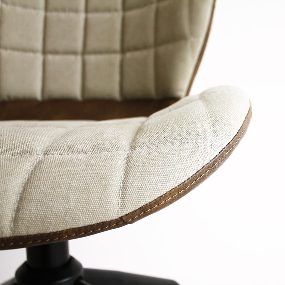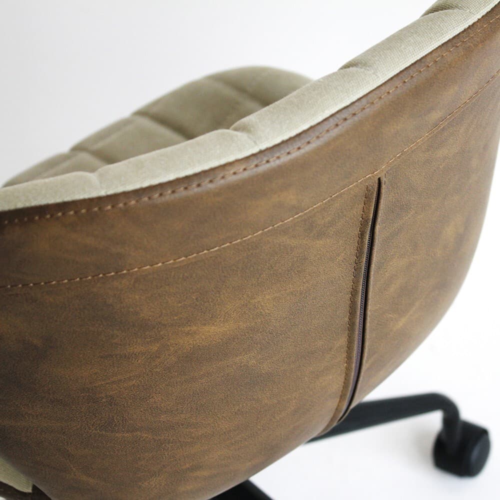レザー風生地とファブリック生地の組み合わせが絶妙なデスクチェアーです。 ステッチ調でインテリア性も高くゆるやかな独特のカーブがやさしく身体と腰を包むこだわりの設計です。 キャスター脚は安心の5本脚で安定感もあり、離着席の動作もスムーズに行えます。
