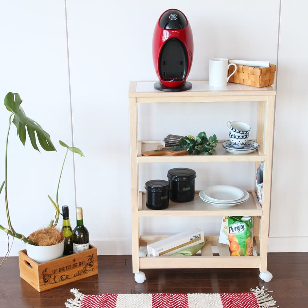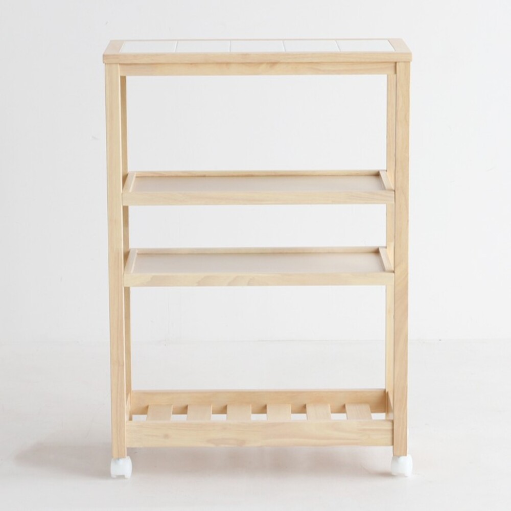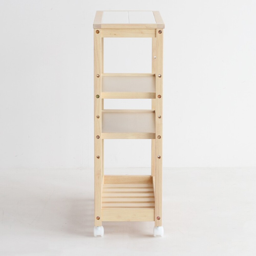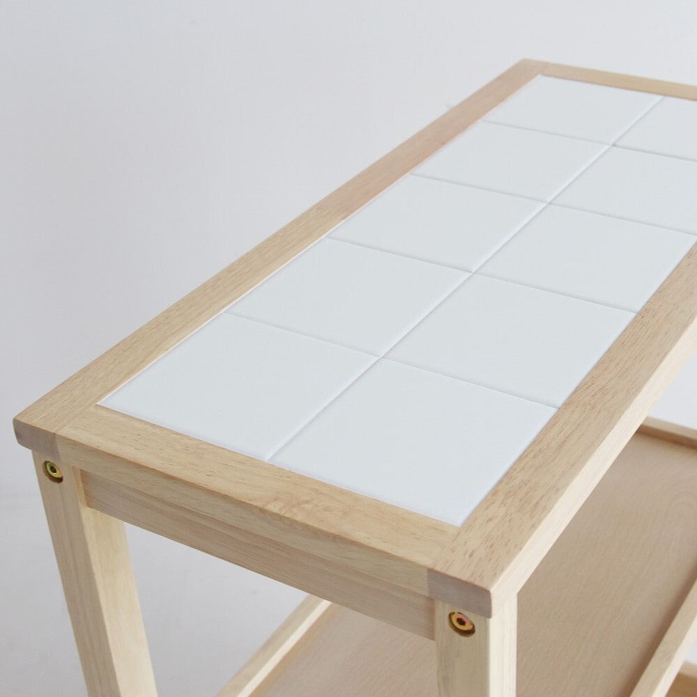 スキマに収納したり、キッチンの作業台として使いやすいワゴンです。 2枚の棚板は5段階の穴のお好きな高さで固定できます。 収納したいものに応じて位置を変えることで、スペースを無駄なく活用できます。 天板には熱に強いタイルがはめ込まれていて、簡易的にお鍋やマグカップを置くのに便利です。 水や汚れがついても落としやすく、お手入れも簡単です。 白くてツヤのあるタイルはデザインのアクセントにもなっています。